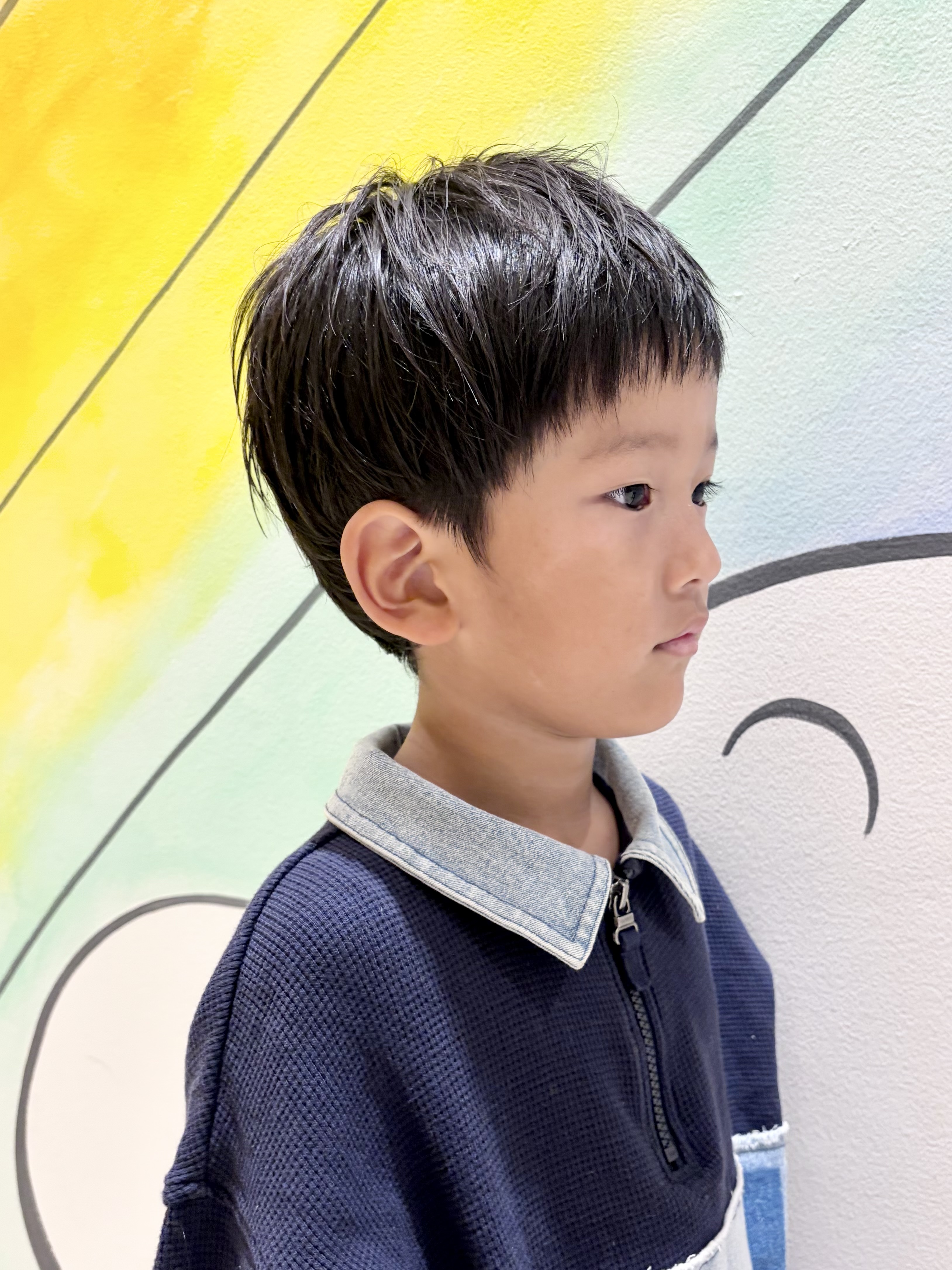 しなぎくん 5さい 七五三に向けてカットしに来てくれたしなぎくんです大人っぽくてカッコ良くて、5歳と聞いてびっくりお気に入りの左右アシンメトリーなスタイルのオーダーをいただきました左は2ブロック、右はスッキリ耳だしに、ウルフっぽくなるように長さを切らずに整えて、全体的にスタイリングで動きが出るよう軽くさせて頂きました最後に5さいさんらしい可愛い1枚いただきました素敵な七五三を迎えられますようにまた遊びにきてね チョキ友のご協力、ありがとうございました