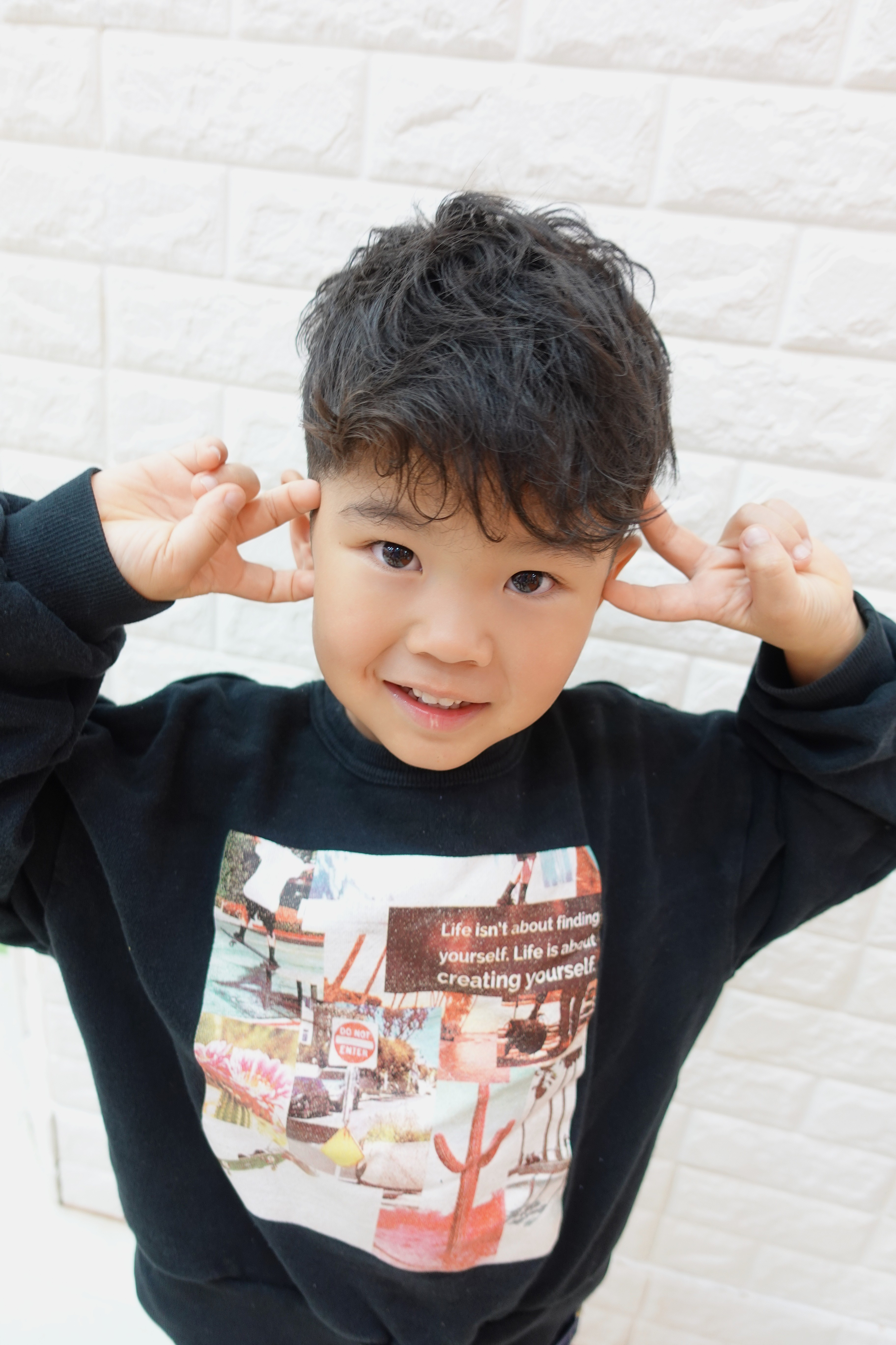 まなとくん 4歳 パーマ風にくせっ毛のカールを生かしたフェードスタイル周りのすっきりさとオーバーのボリュームのメリハリで大人顔負けのかっこよさとってもお似合いでかっこいいお写真のご協力ありがとうございました