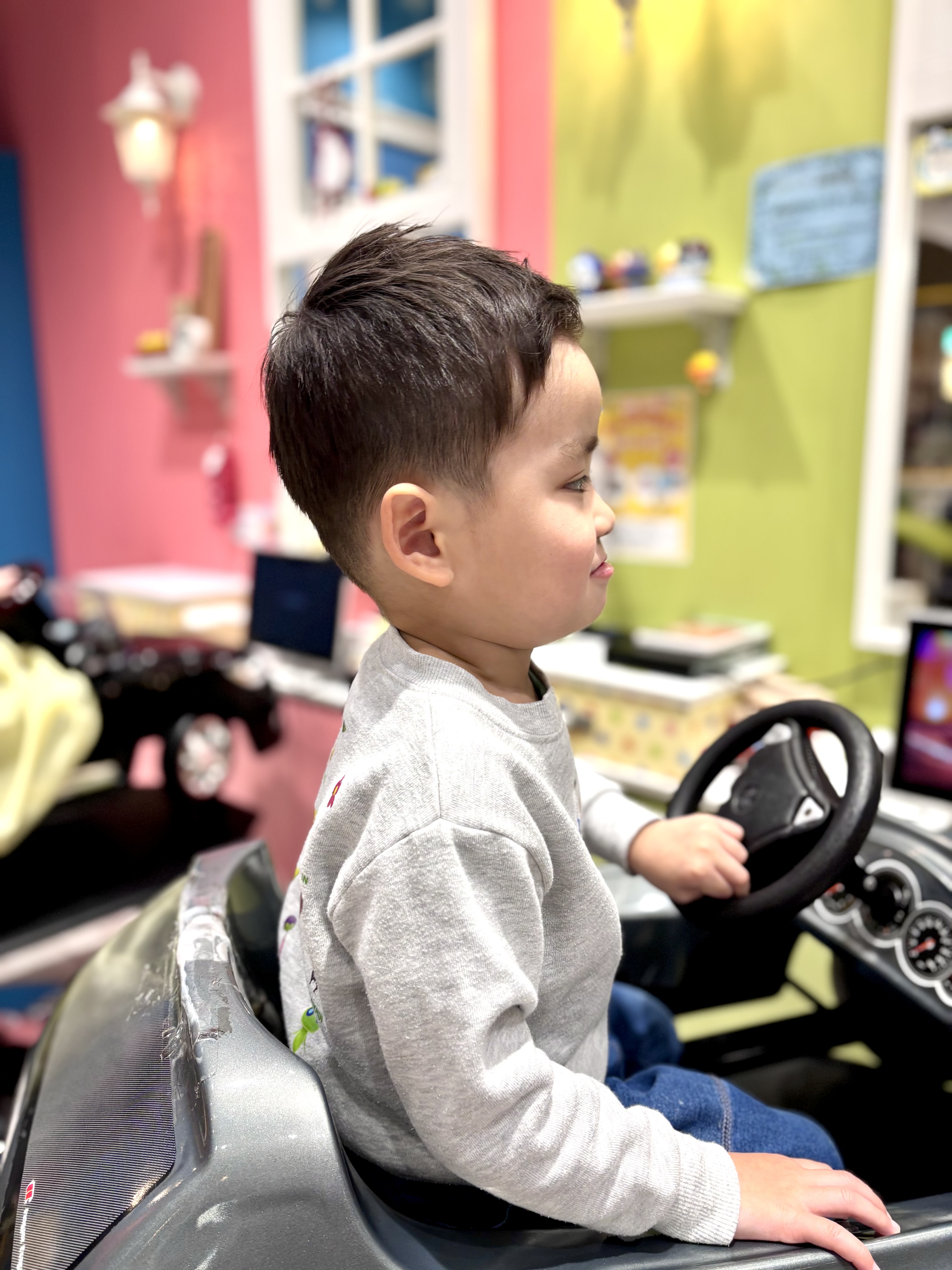 ゆうせい君 バリカン使って周りは刈り上げてソフトモヒカンスタイルです爽やかに前髪あげてセットしましたカット中はテレビに夢中でしたが、カメラを向けるとちょっと変顔⁈したり、かわいいゆうせい君でしたお母様、お写真のご協力ありがとうございました。またのご利用お待ちしております。