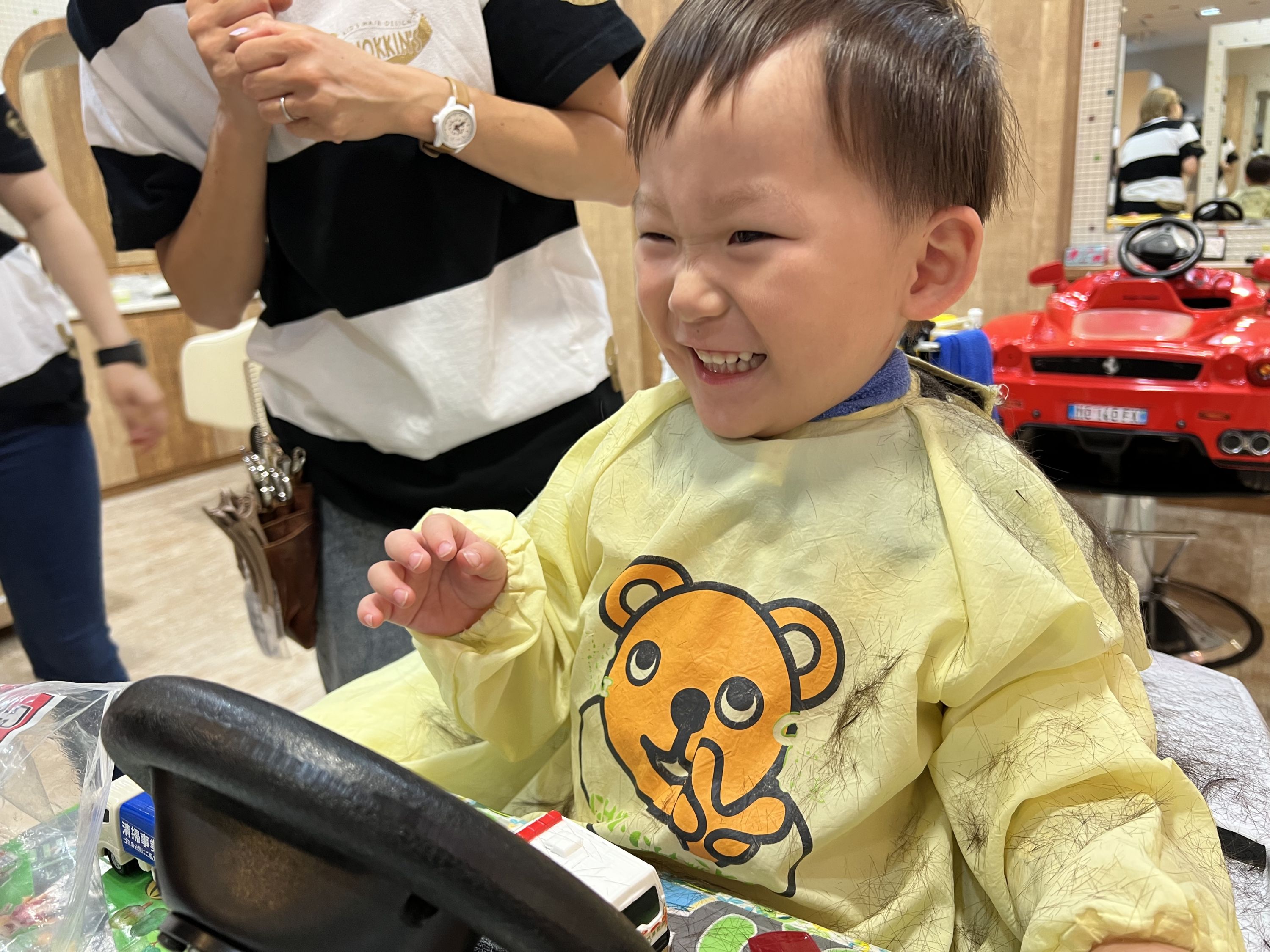 こんにちはチョッキンズのお姉さんたちです今日はお車大好きニコニコなお友だちを紹介したいと思います とってもカッコイイお車をたーーくさん持ってきてくれて遊びながらチョキチョキSTART 『みてみて~』と紹介もしてくれたよ お家ではイヤイヤ~なバリカンもとーっても上手 そしてカット中はずっとニコニコ お姉さんたちとママの『かっこいい~』の一言でこんな笑顔も見せてくれました ドキドキのシャンプーも終った後にはニッコリ ドライヤーも完璧で初めてのチョッキンズパーフェクト 髪型のモデルさんも完璧にこなしてくれて最後までニコニコ笑顔を見せてくれました お姉さんたちと遊んでくれてニコニコ笑顔見せてくれてとっても嬉しかったよまたお車で遊ぼうね お母様もお写真にご協力頂きかわいいお写真を撮らせていただきありがとうございました