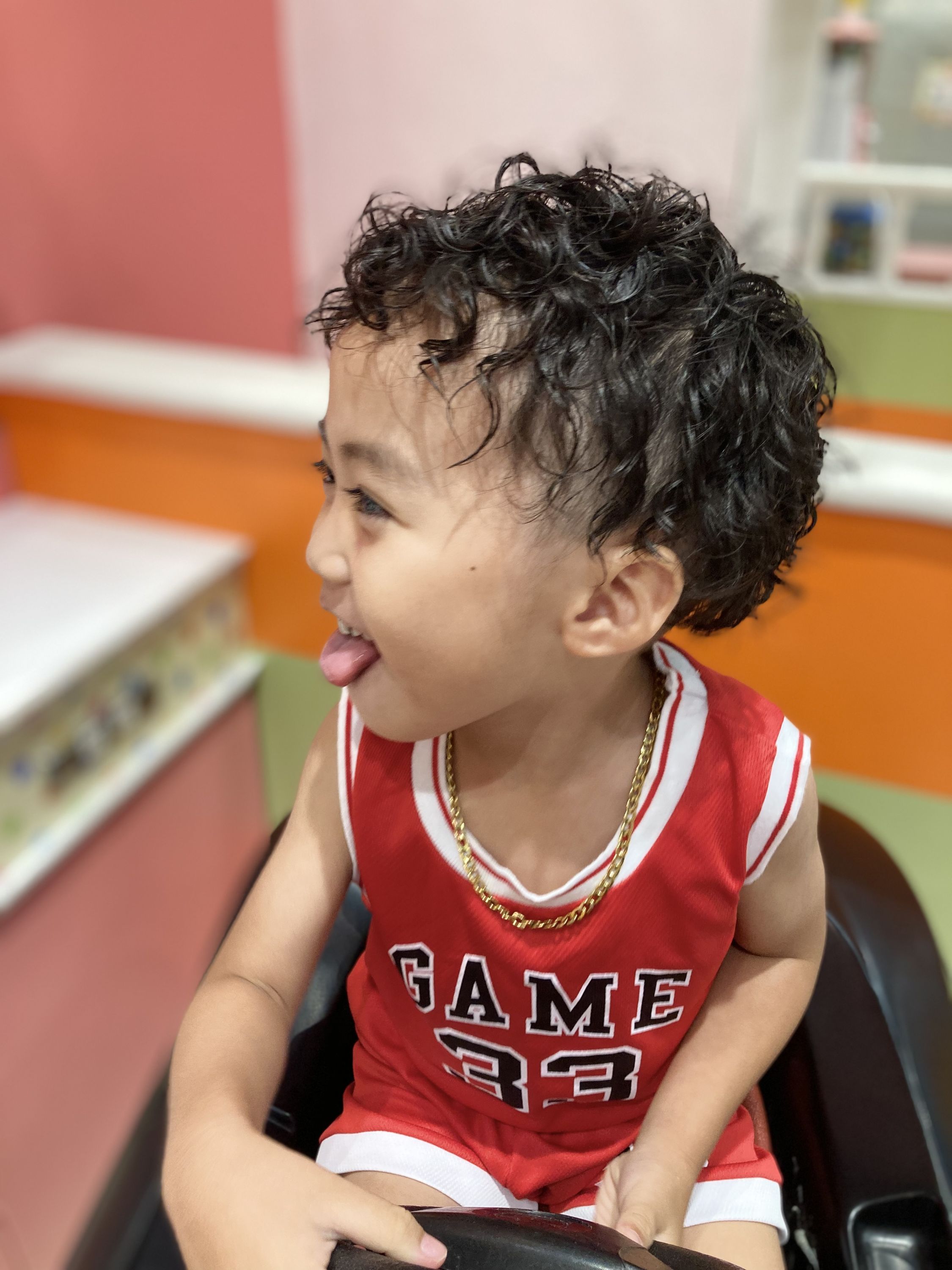 いおくん 4歳 初めてチョッキンズに来てくれたいおくんパパと同じ髪型にしたいと言って、パーマをかけにきてくれました❣️痛〜い、冷た〜い、臭〜いと言いながら笑2時間よく頑張ってくれました‼️頑張ったかいあってとってもカッコよく、ファンキーになりました"(∩>ω<∩)"♥️おしゃれなお洋服にもバッチリ似合ってます撮影のご協力ありがとうございました😄スタッフ一同またのご来店をお待ちしております