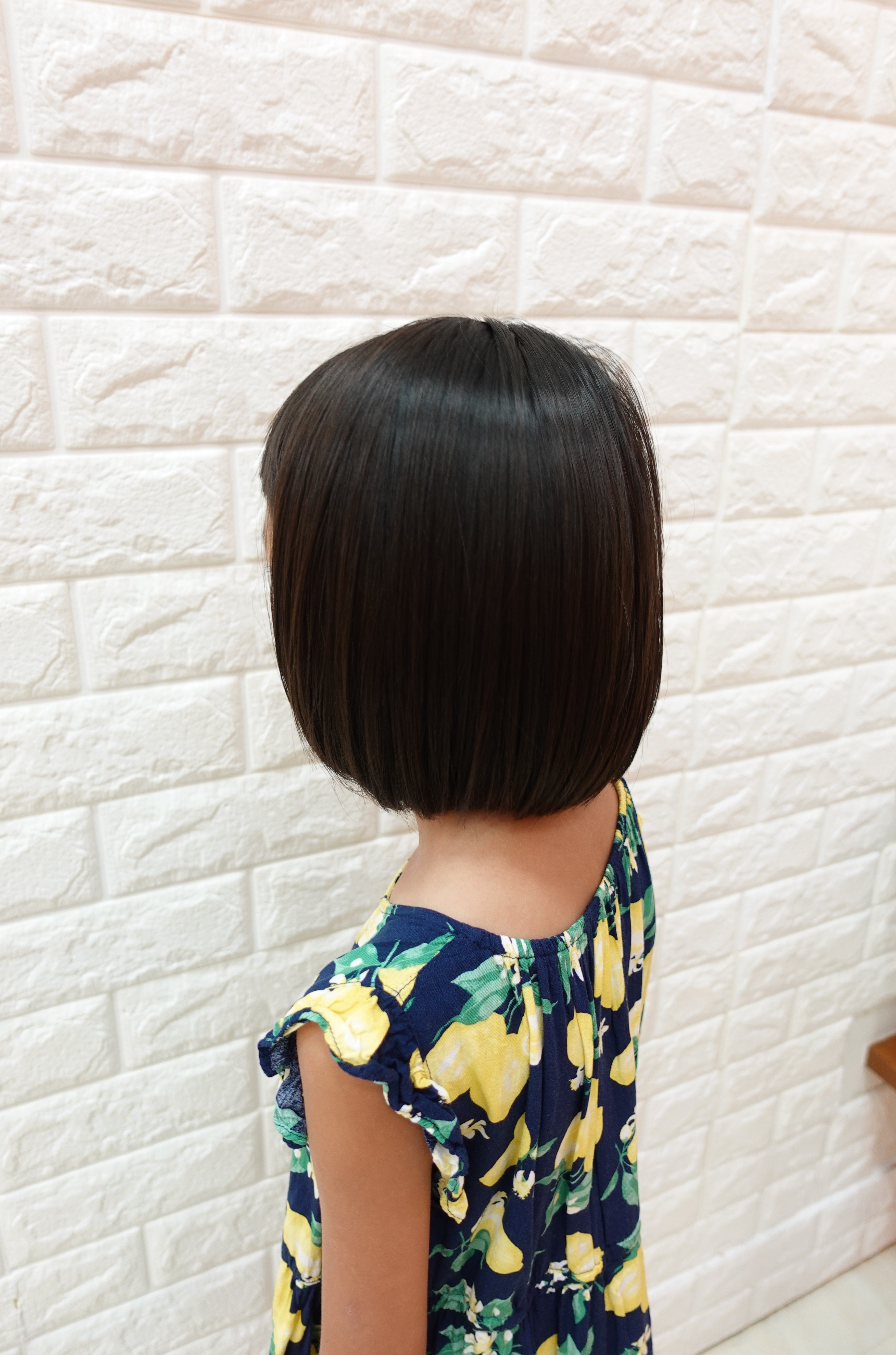 みゆちゃん 7歳 サラつやヘアを生かしたボブスタイル短めバングでお顔周りすっきり 可愛さアップお耳にかけると涼し気とってもお似合いで可愛いですお写真のご協力ありがとうございます