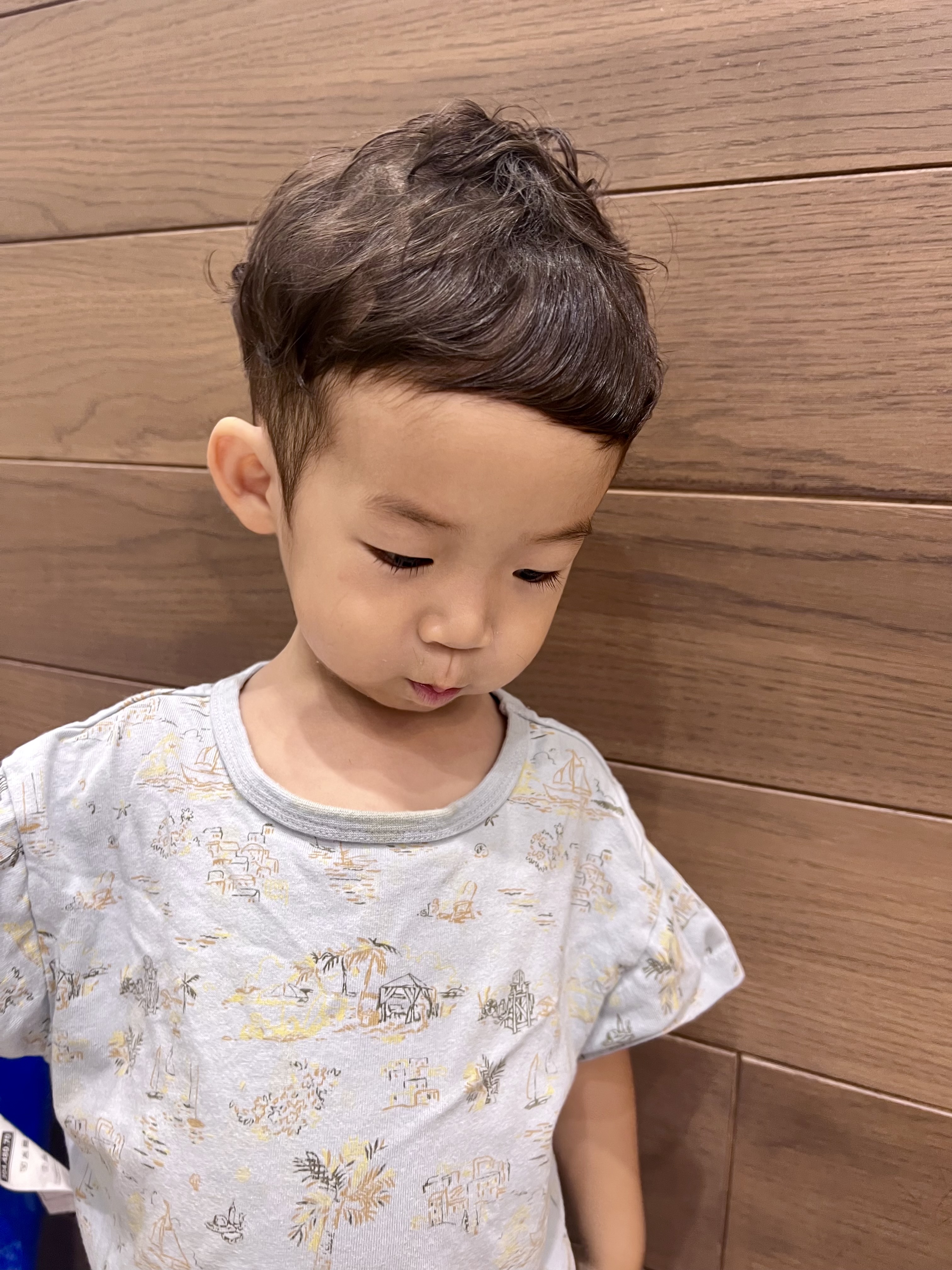 まひろくん 2才 くるくるなくせ毛を生かしてトップは残してぐるりと一周ツーブロックのマッシュに トップは長めに残してパーマのようにくるくるでおしゃれ感アップとっても可愛くかっこよくなりました初めてのバリカンもとっても上手でした!お母様、お父様、お写真の御協力ありがとうございましたまたお待ちしております