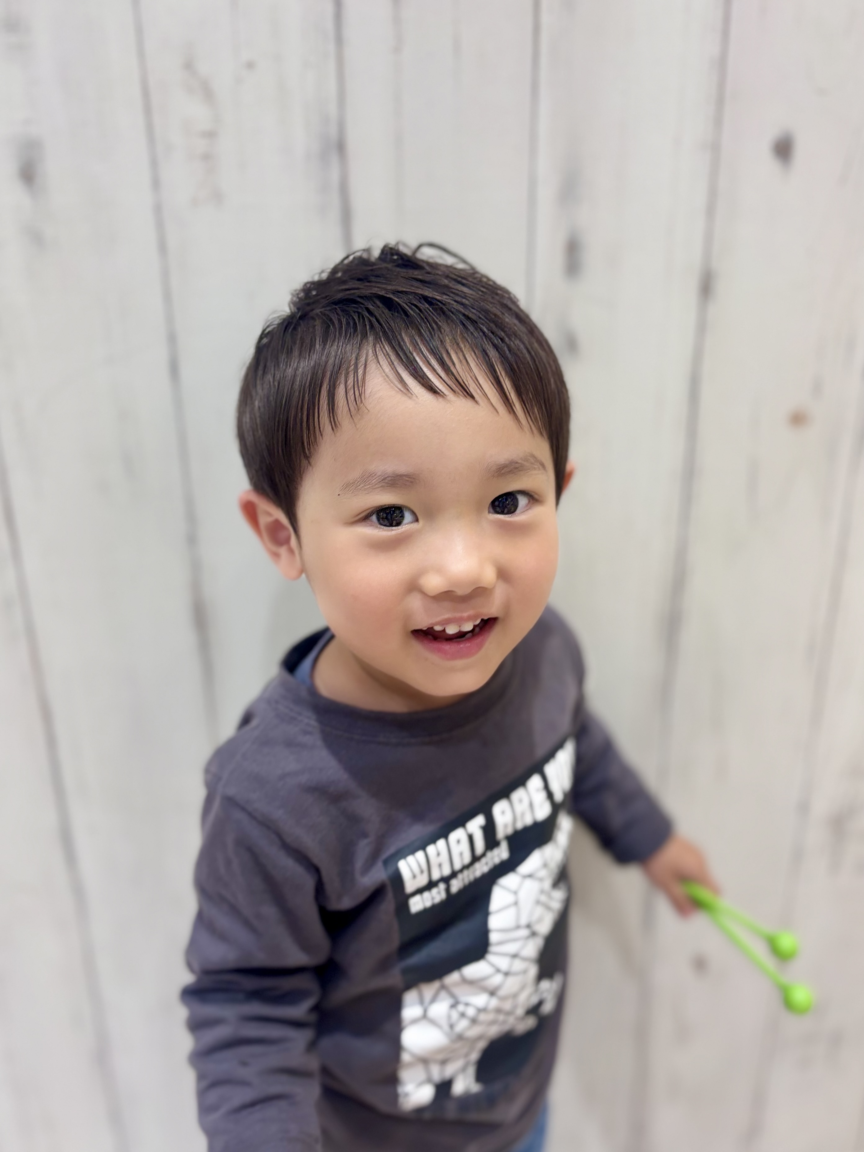 あやとくん 3歳 はえ癖が少しありますが癖の出方を見ながらハサミでしっかり耳を出し、クリクリお目目に似合うような丸みをつけたショートに仕上げました。お気に入りのアンパンマン鉄筋おもちゃを持ってモデルさんも頑張ってくれました撮影のご協力ありがとうございましたスタッフ一同またのご来店をお待ちしております