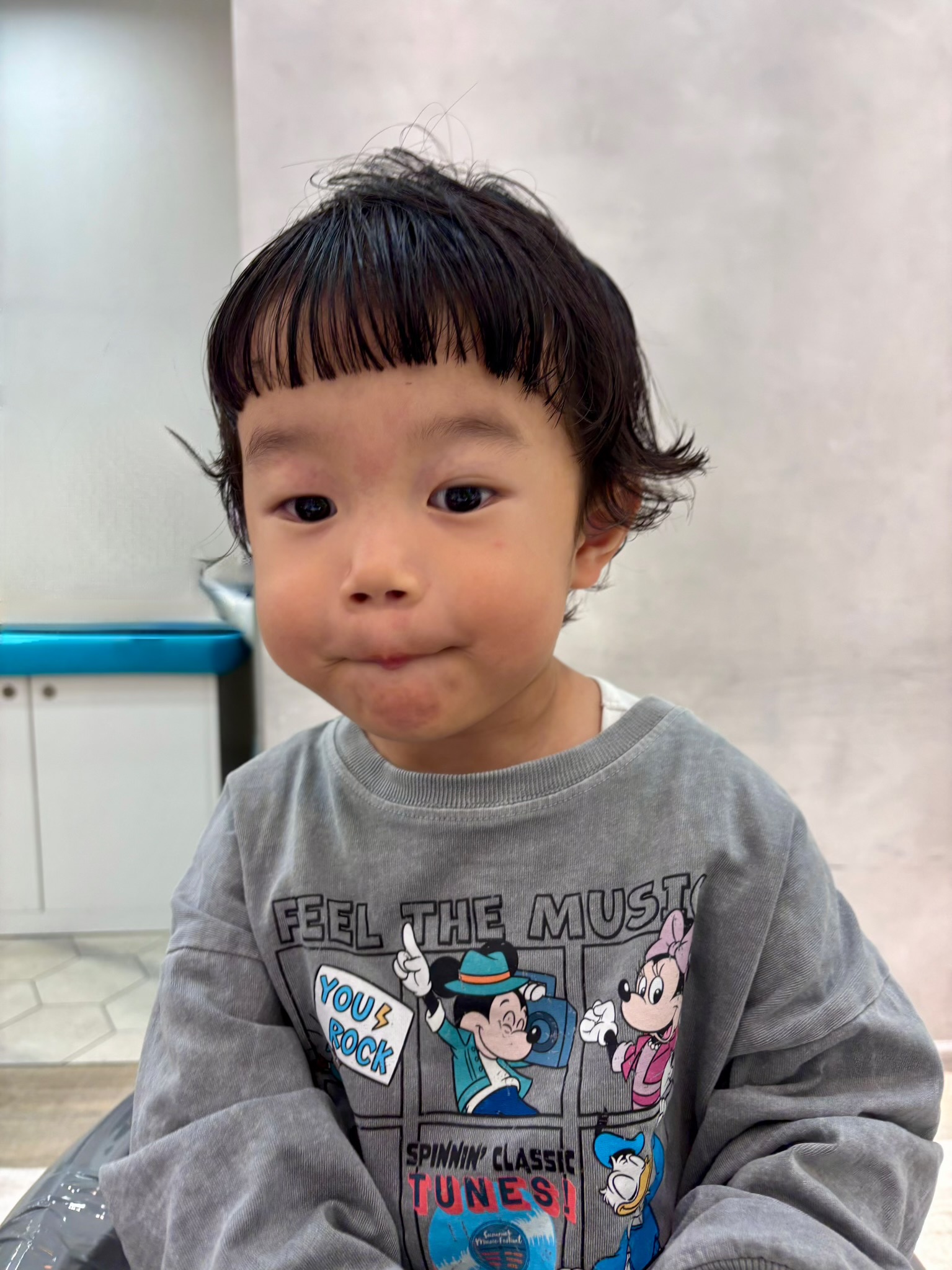☆ Uくん 2さい ☆ とても上手に頑張ったUくん 前髪はぱっつん、横と後ろは伸びてきた髪の毛とくせ毛を活かしてウルフカットにしました^^ とても似合っていて素敵でしたー!! 最後のポーズもかわいいです♡ お写真ご協力ありがとうございました!!!^^