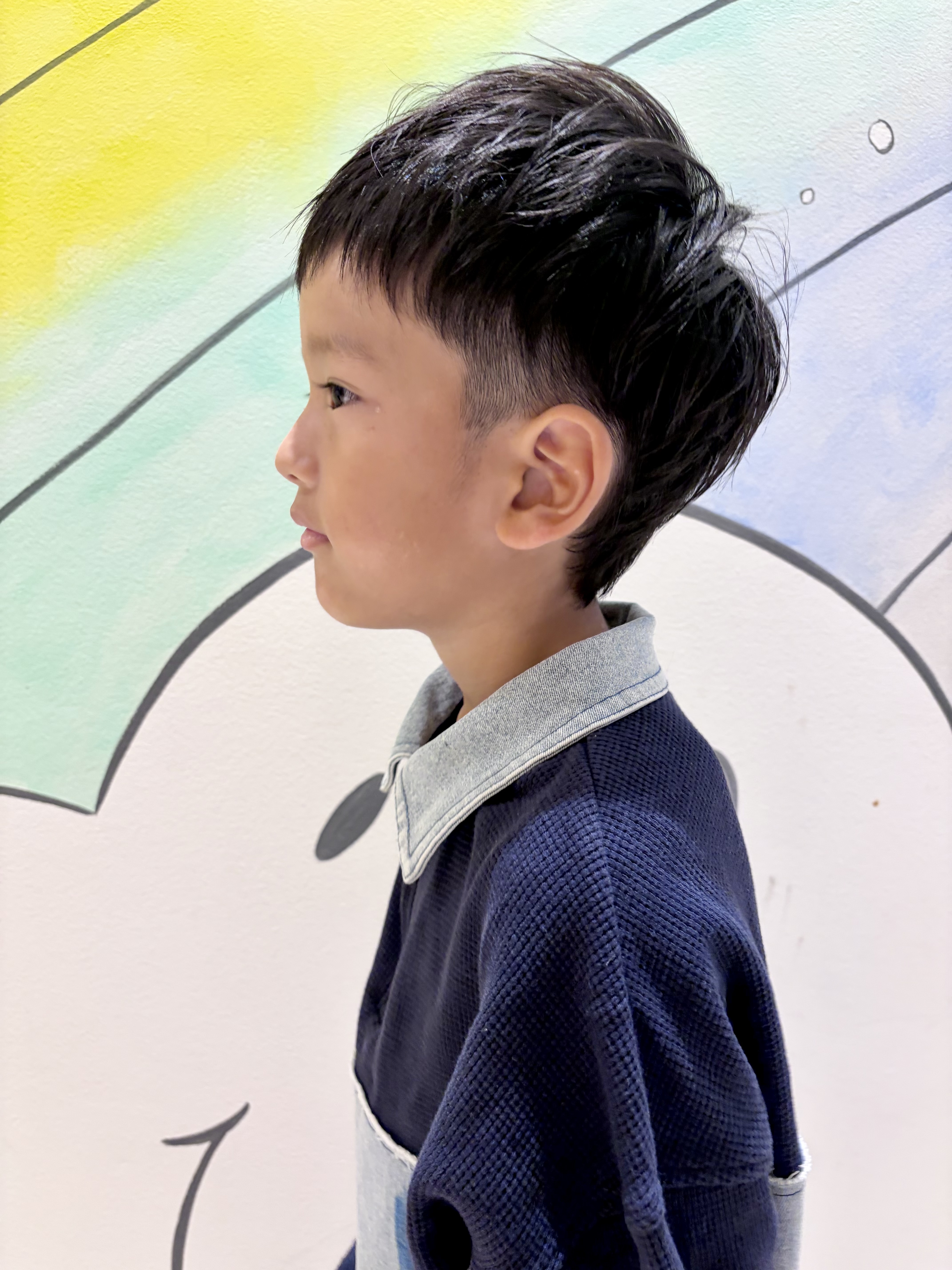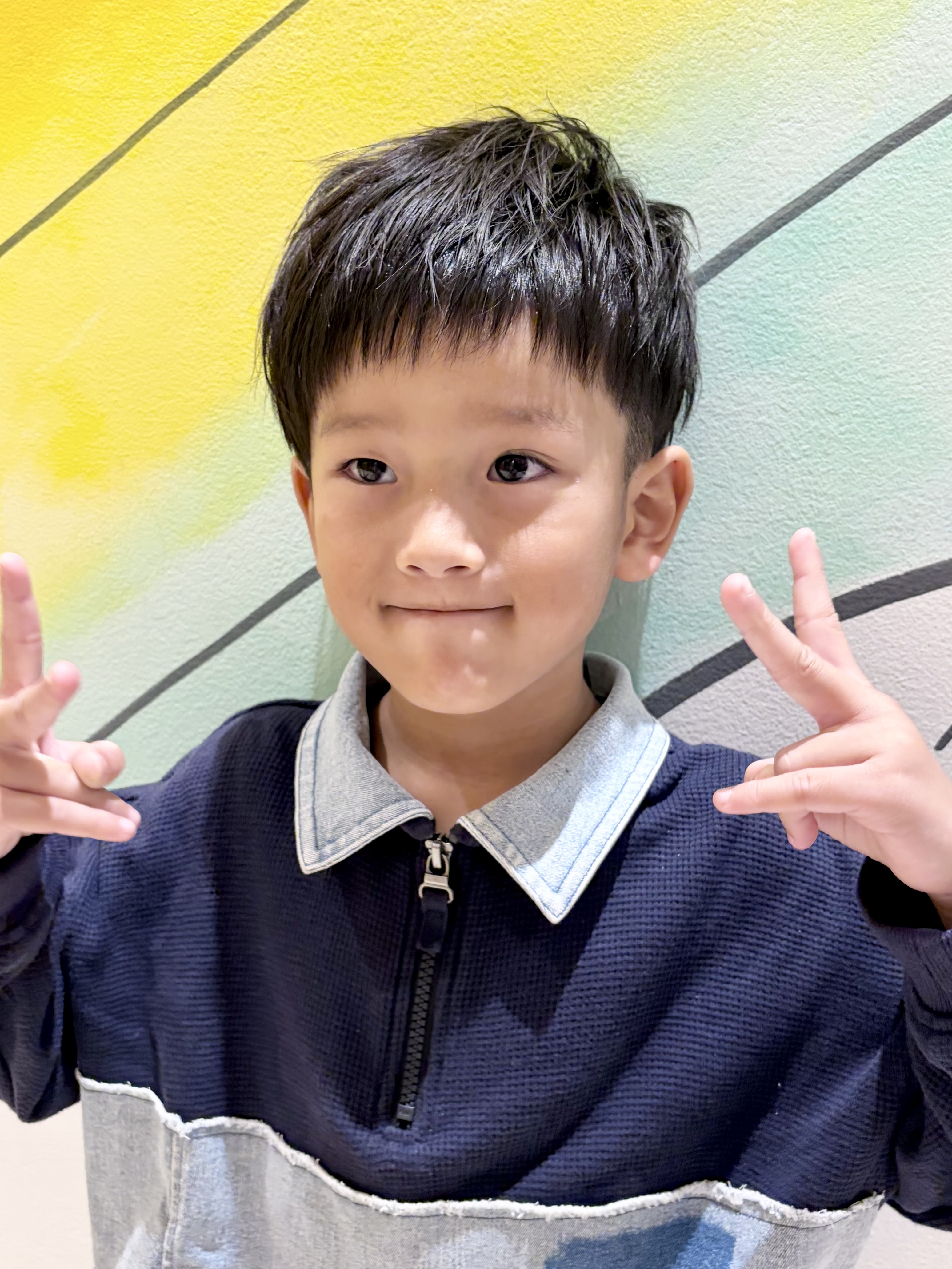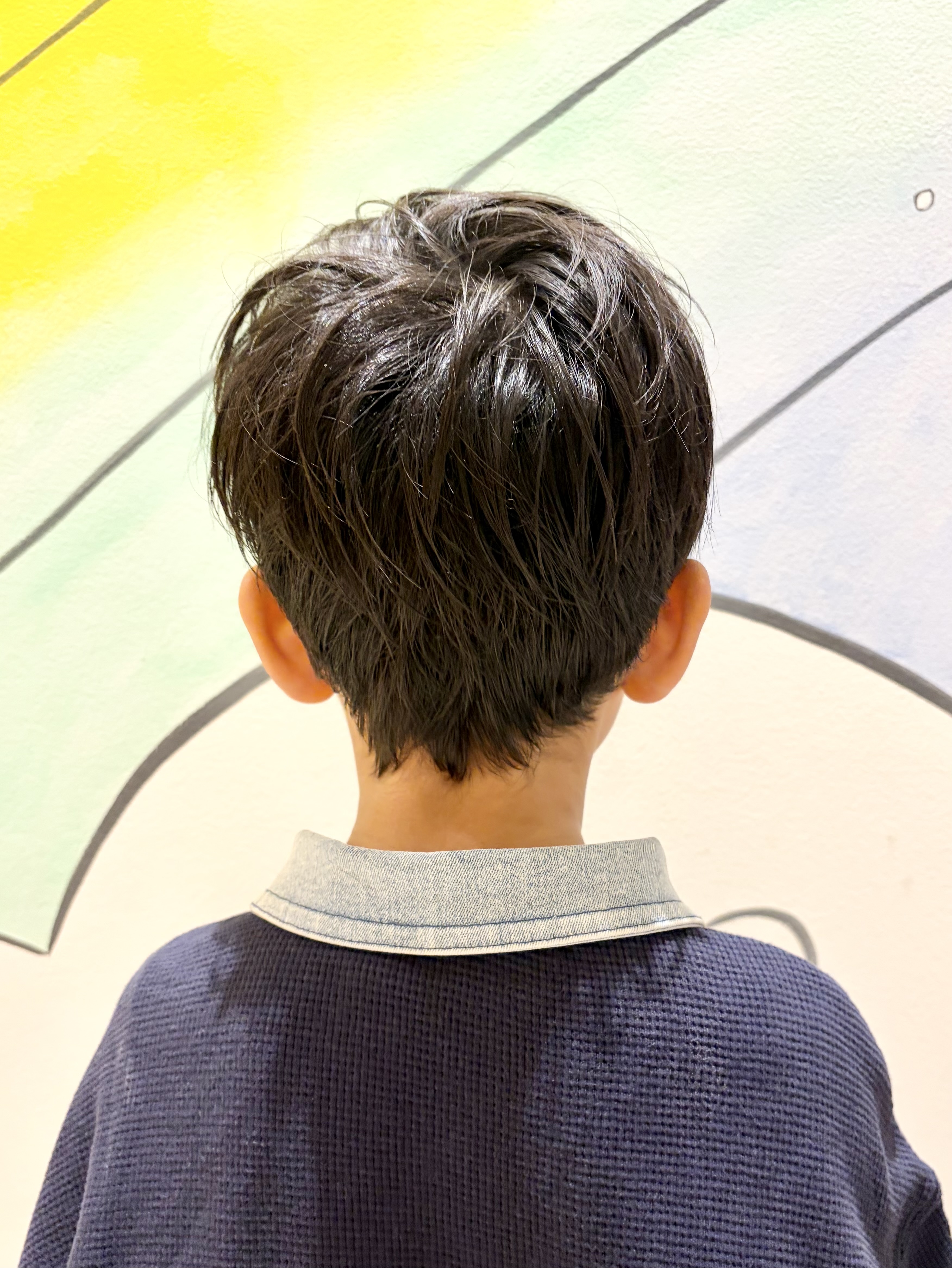 しなぎくん 5さい 七五三に向けてカットしに来てくれたしなぎくんです大人っぽくてカッコ良くて、5歳と聞いてびっくりお気に入りの左右アシンメトリーなスタイルのオーダーをいただきました左は2ブロック、右はスッキリ耳だしに、ウルフっぽくなるように長さを切らずに整えて、全体的にスタイリングで動きが出るよう軽くさせて頂きました最後に5さいさんらしい可愛い1枚いただきました素敵な七五三を迎えられますようにまた遊びにきてね チョキ友のご協力、ありがとうございました