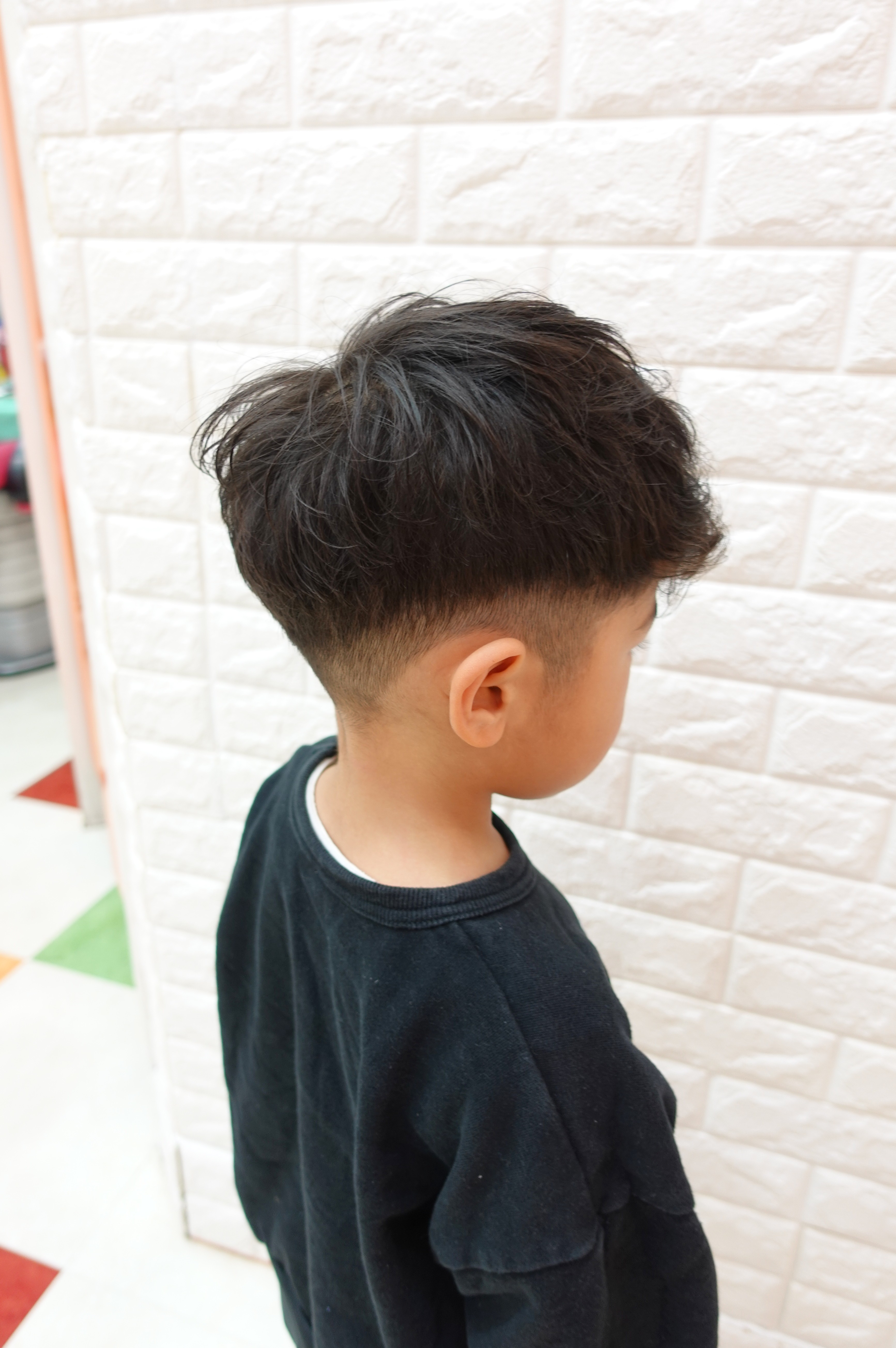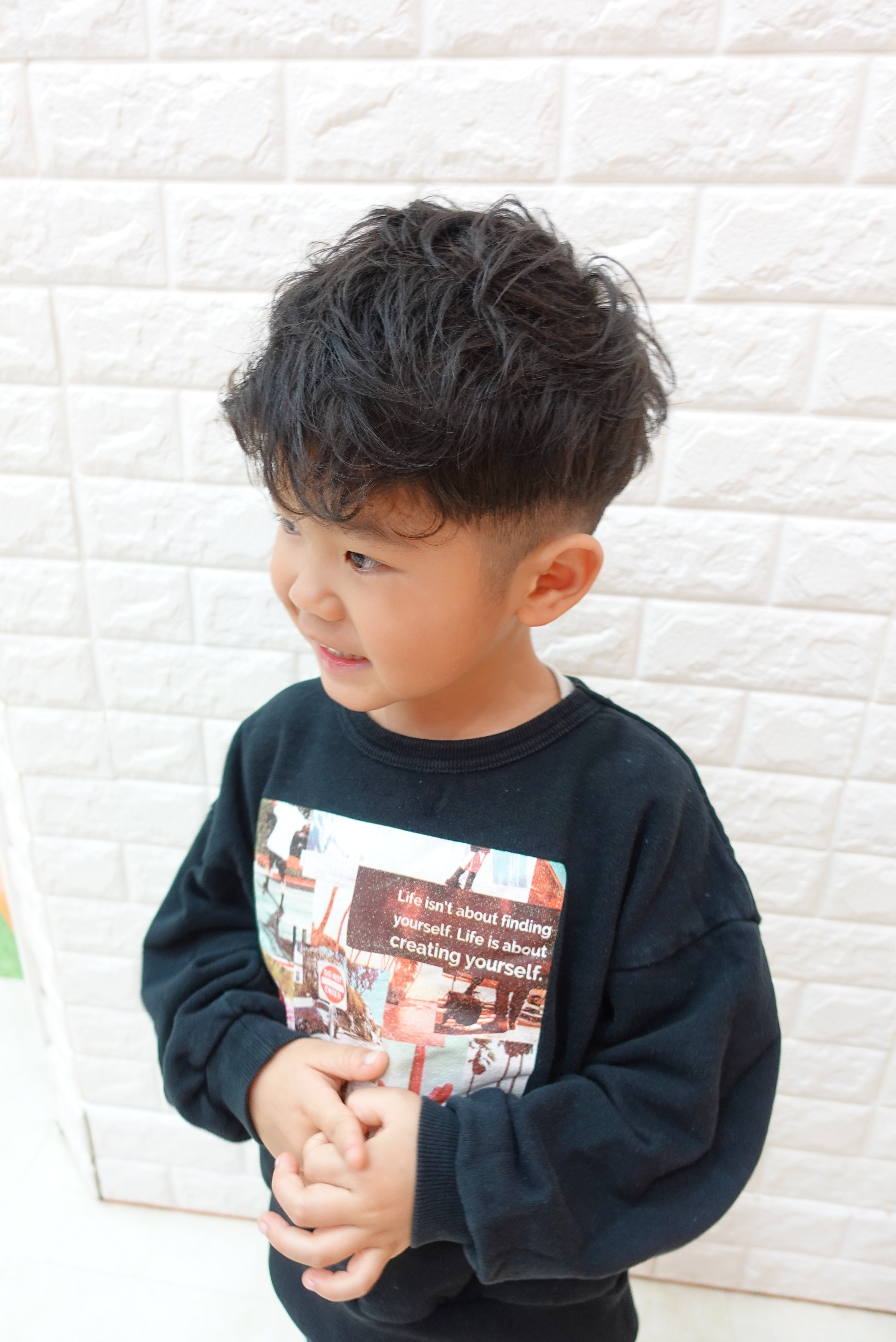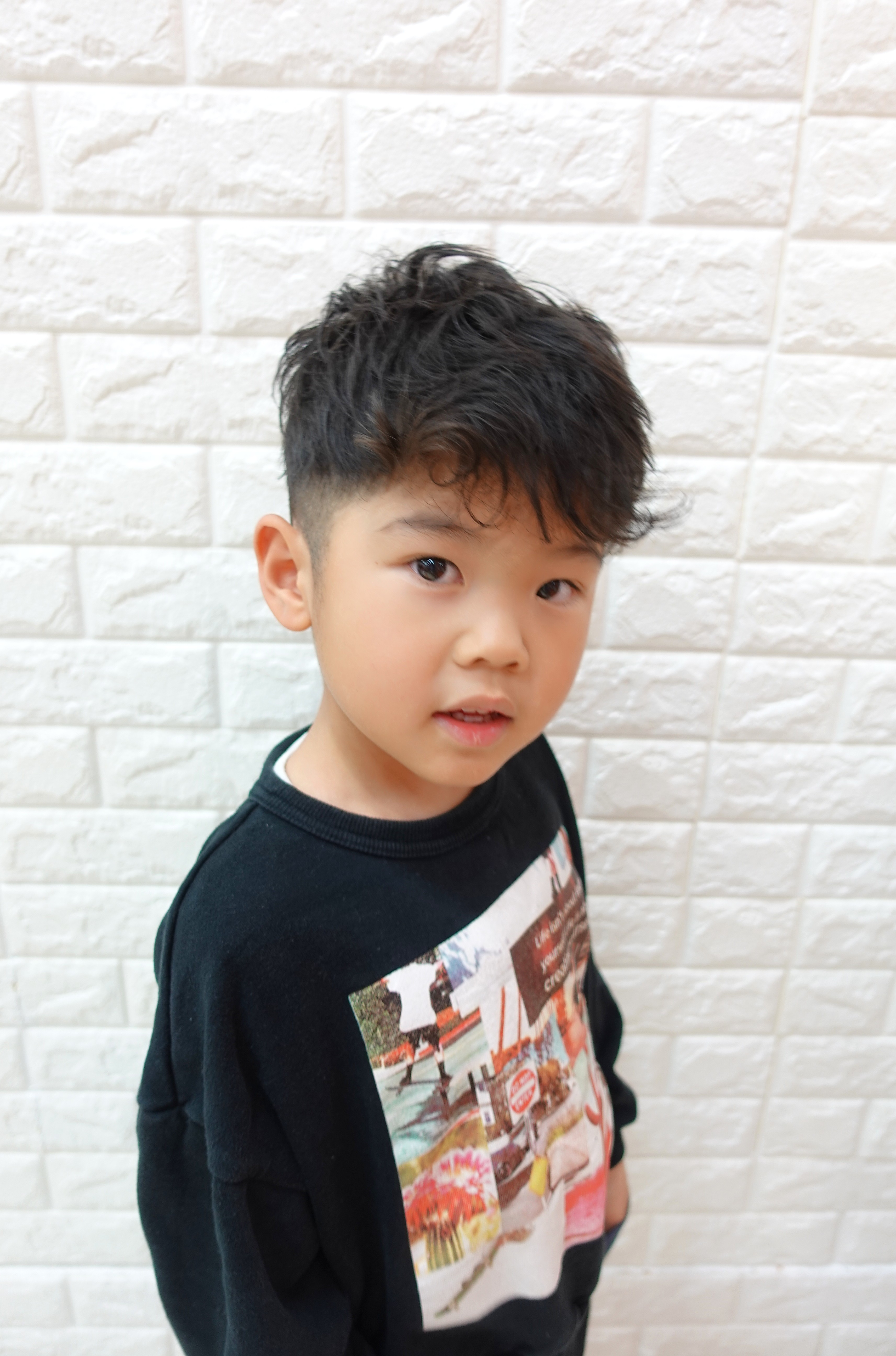 まなとくん 4歳 パーマ風にくせっ毛のカールを生かしたフェードスタイル周りのすっきりさとオーバーのボリュームのメリハリで大人顔負けのかっこよさとってもお似合いでかっこいいお写真のご協力ありがとうございました