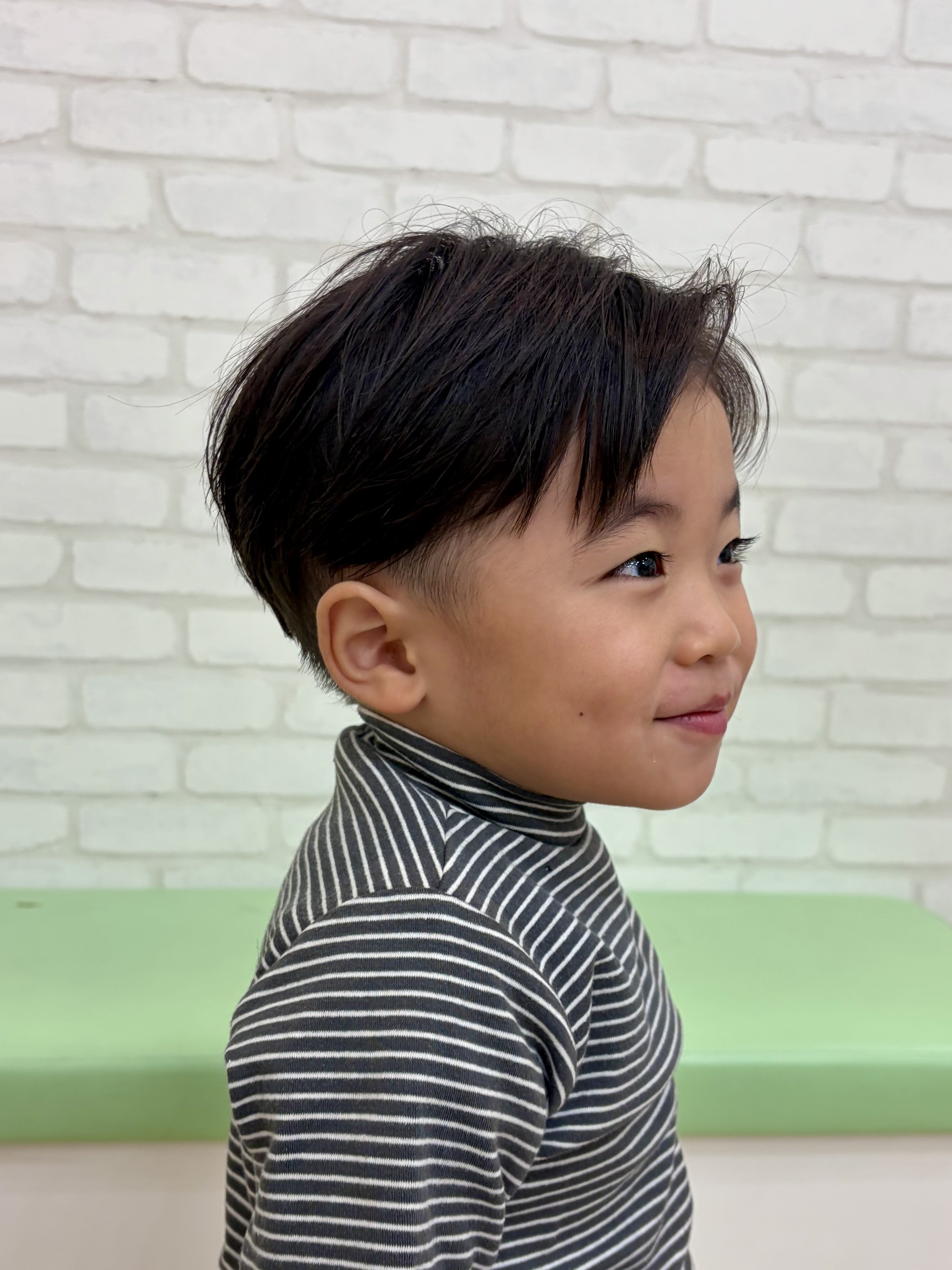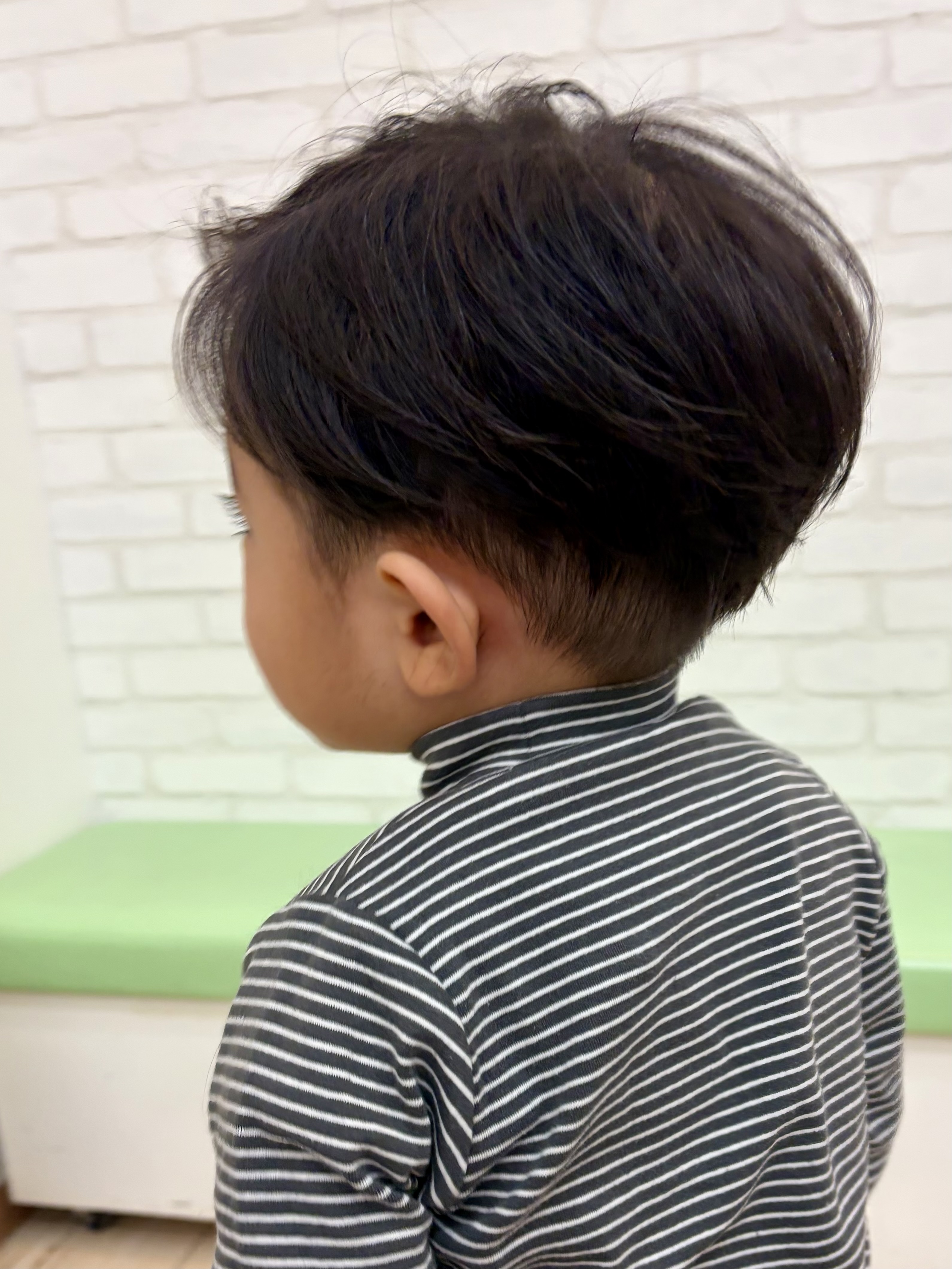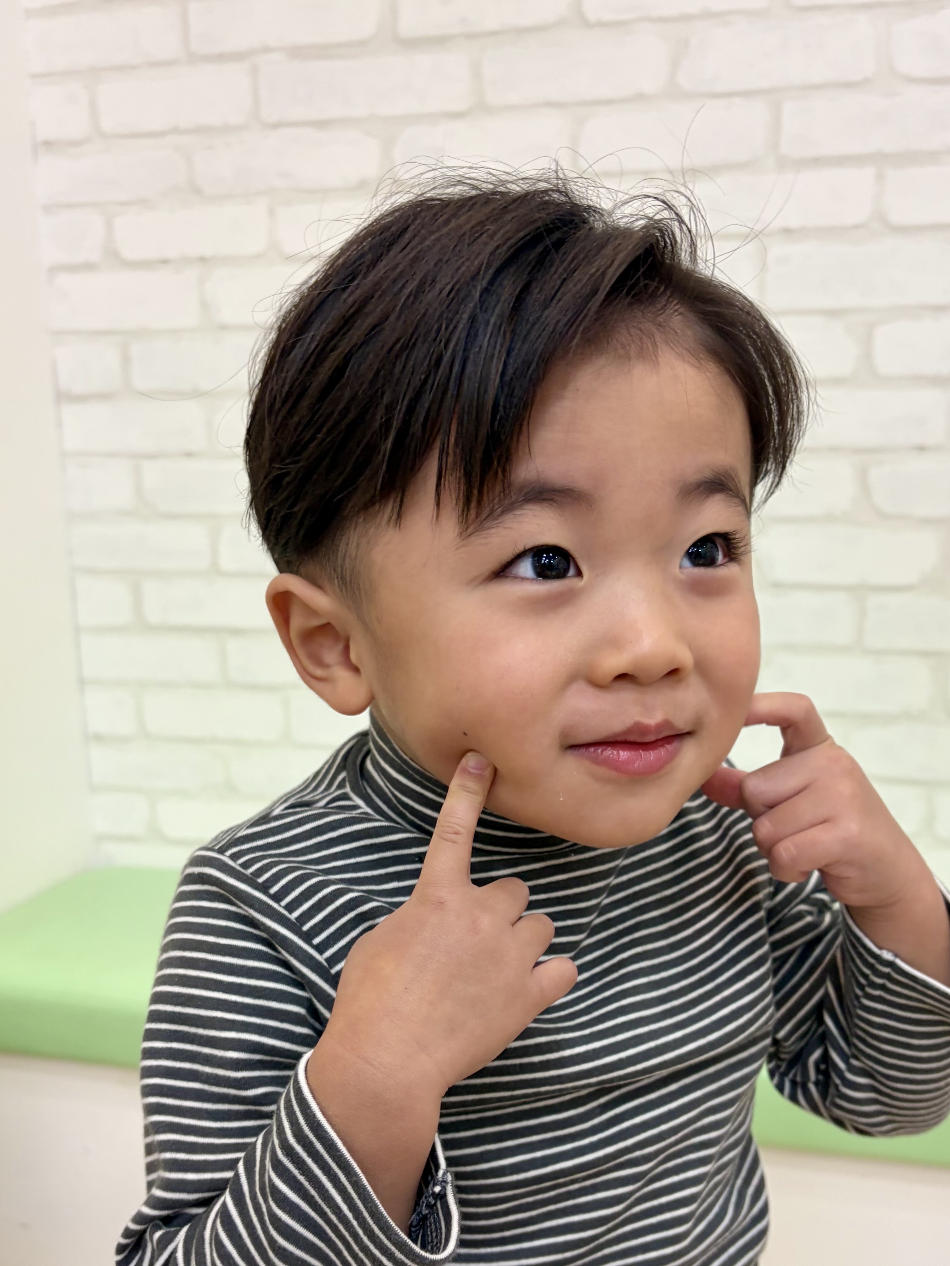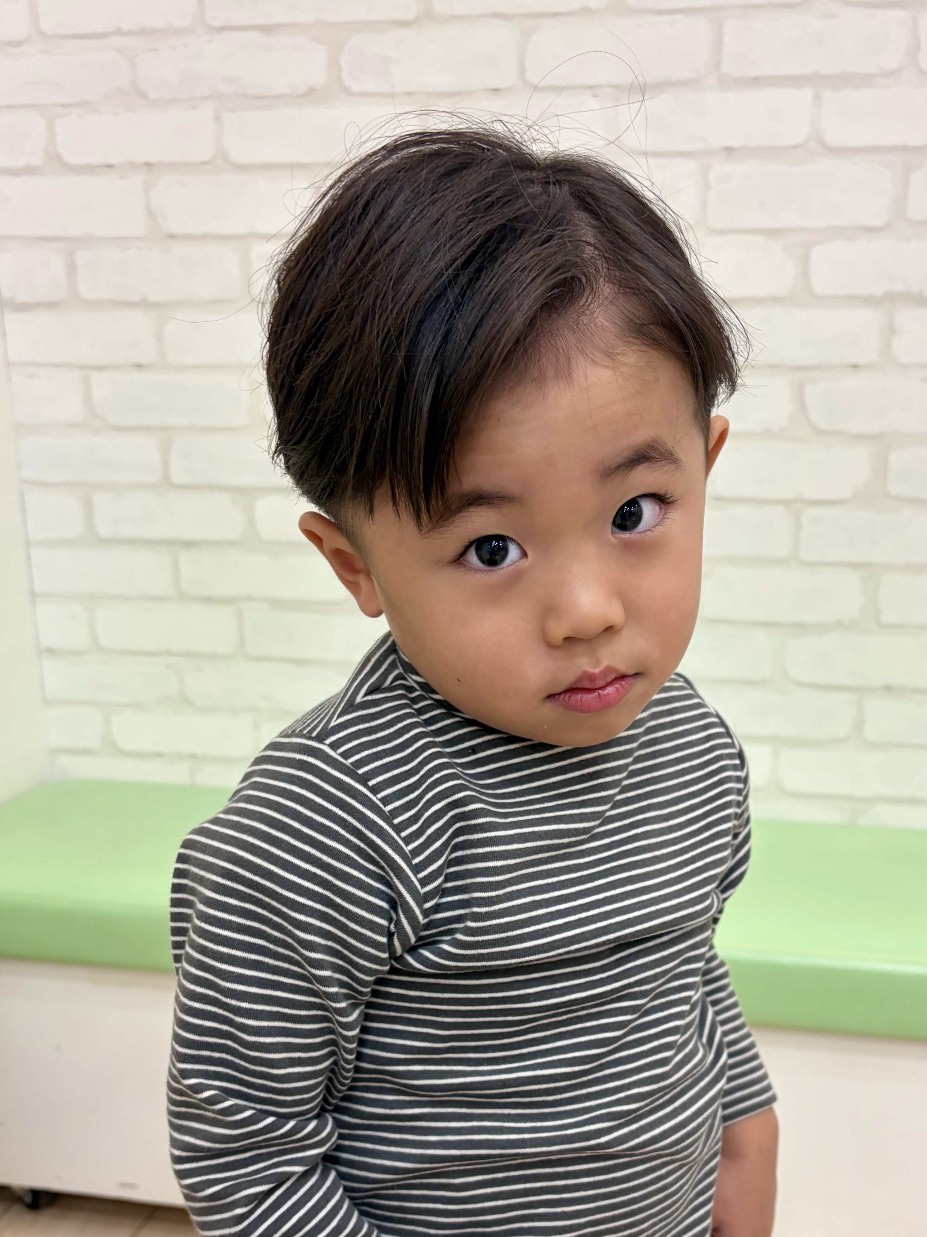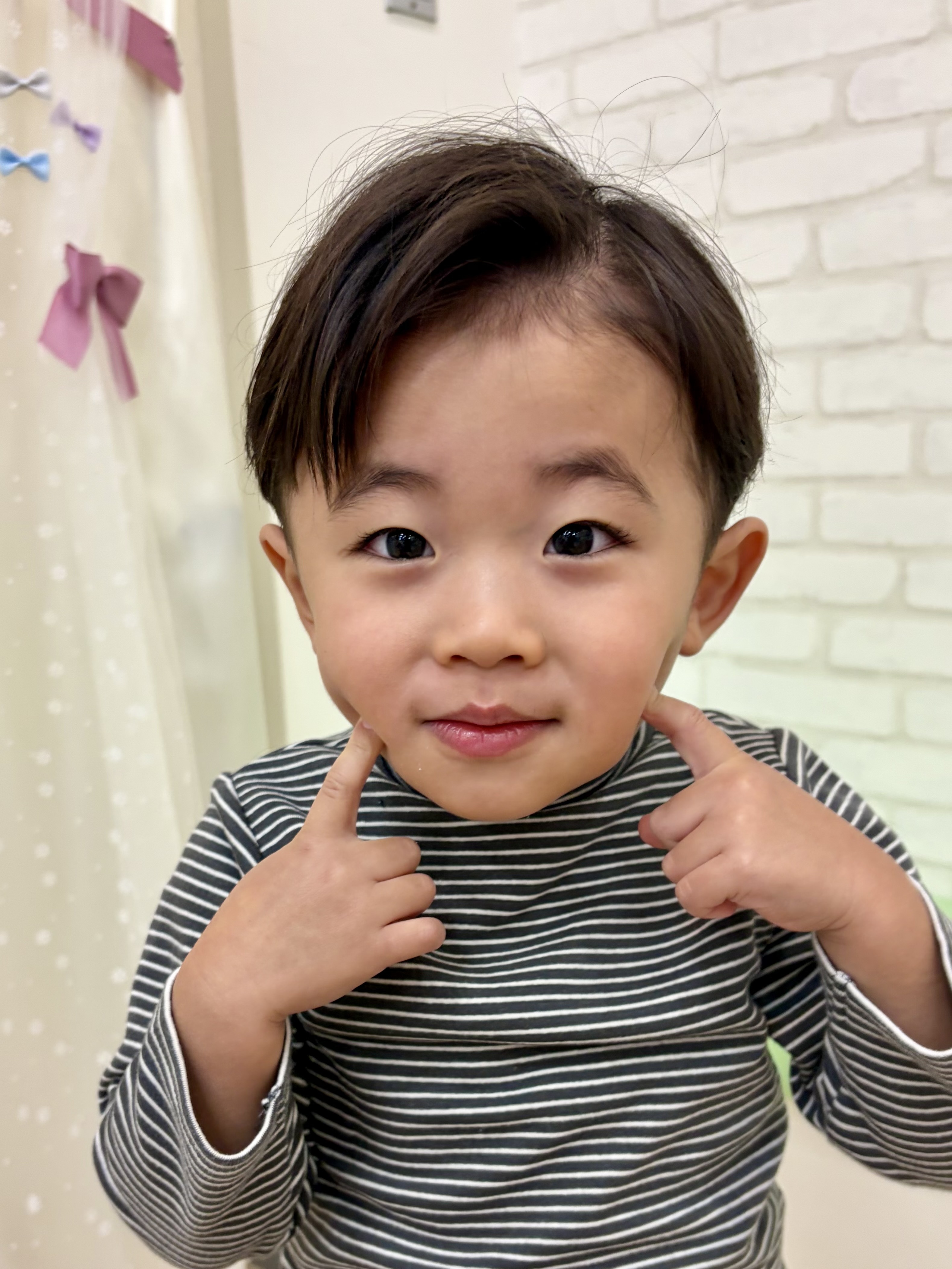 ぎんたくん2歳結婚式に出席するので、かっこよくカットをしにきてくれました☺️初めてのチョッキンズでしたが、とっても上手にカットさせてくれてありがとう!😆ベースは2ブロックのマッシュで前髪をあげて、フォーマルな服装にも合うように、キリッとスタイリングしました。ブログのご協力ありがとうございました😊