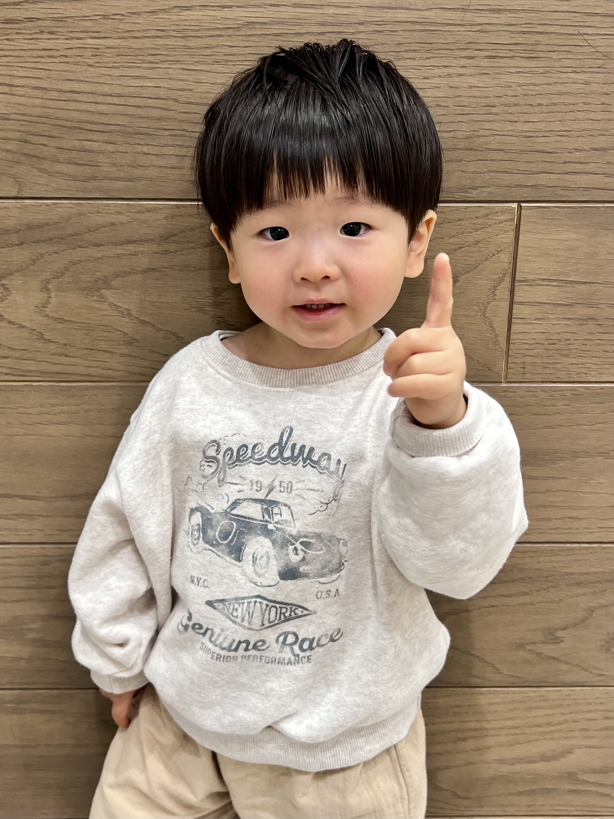 かいりくん 2歳 いつも遊びに来てくれる、かいりくんいつもは途中で涙が出ちゃったりだけど初めてにこにこ上手にチョッキンできたよ✂️ 襟足を少し長めに残しサイドはナチュラルにツーブロックして韓国風ショートにとってもお似合いです モデルさんもとっても上手👏ポーズもばっちり可愛かったです お写真のご協力ありがとうございました😊またお待ちしております✨✨