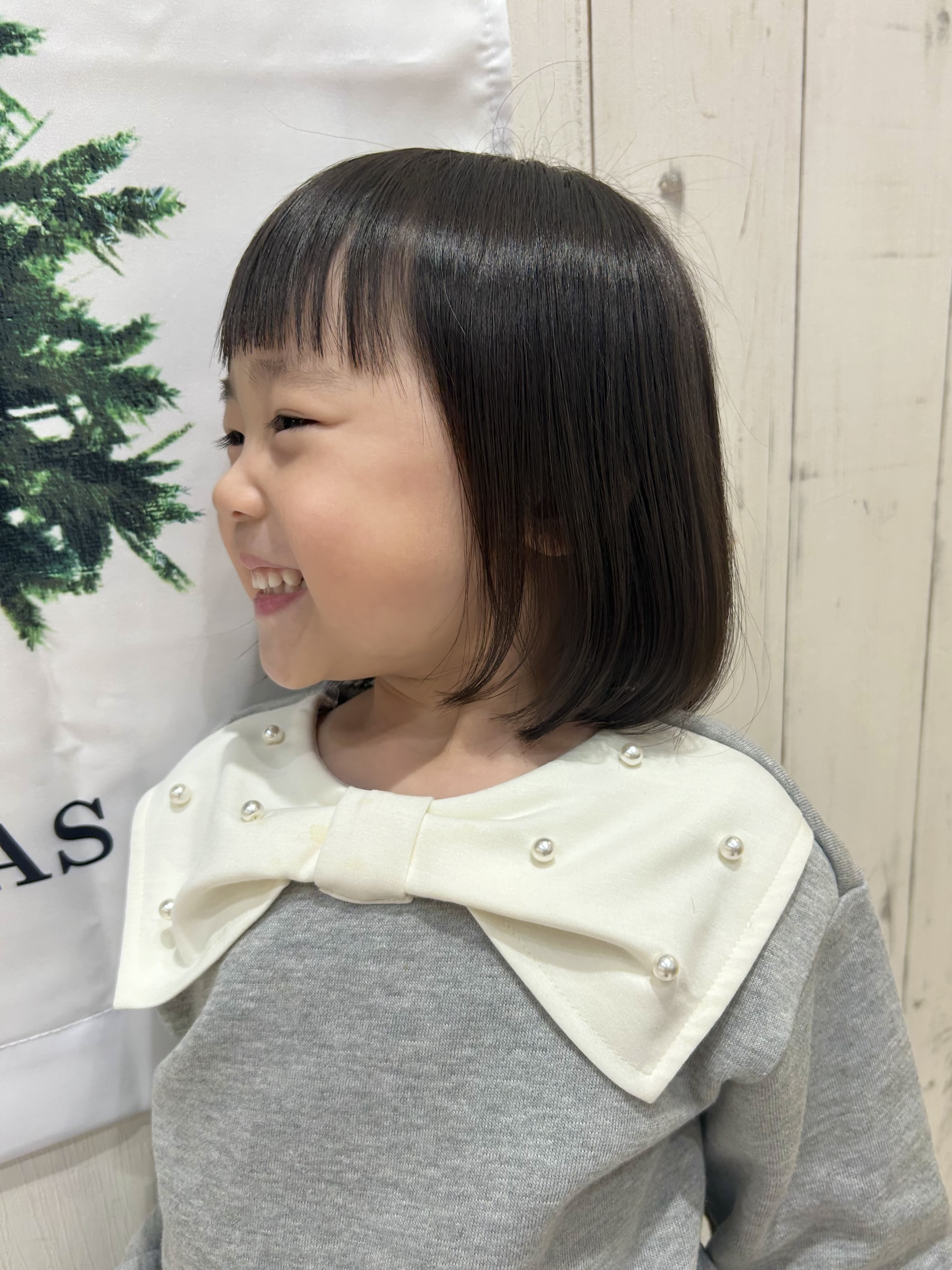 👧りさちゃん👧 4歳✌︎ 【前上がりボブ】肩よりも少し下に長さを設定して、顔周りを前上がりに仕上げたボブです✨前から見た時に顔周りがスッキリ見えますね☺︎まゆげが見える前髪は、りさちゃんの可愛らしさをより一層引き立ててます❤︎チョキチョキもお写真もとても上手にできましたね!ご協力ありがとうございました☺︎☺︎☺︎