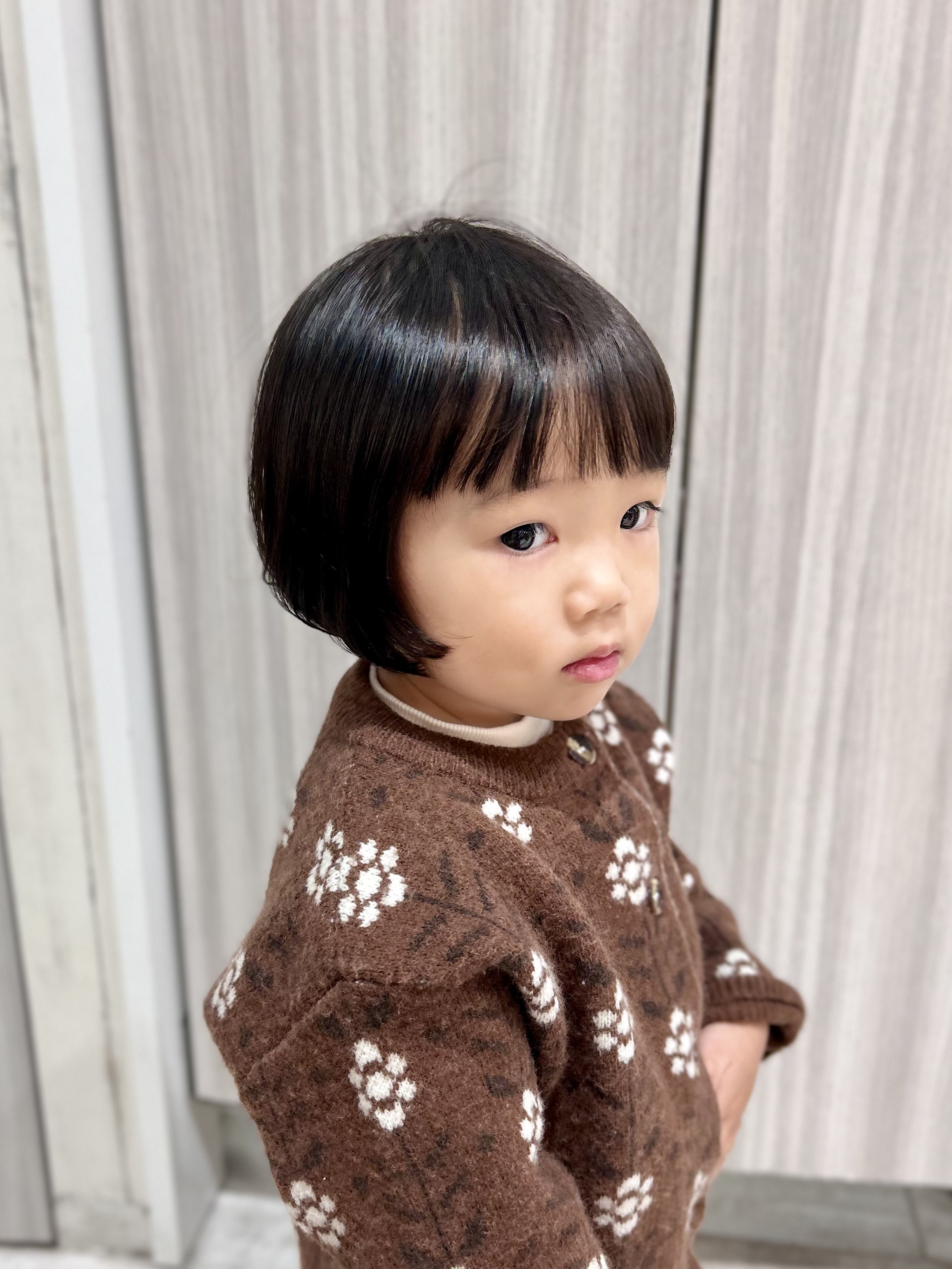 まりのちゃん 2歳 内巻きになる髪質をいかして、くるんと丸みのあるボブスタイル❣️❣️冬服やマフラーなどで首周りがもたつきやすい時期ですが、冬こそ首周りスッキリ!とっても可愛いいです🥰撮影のご協力ありがとうございました🤗