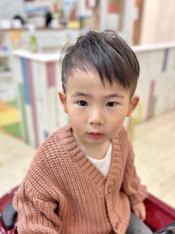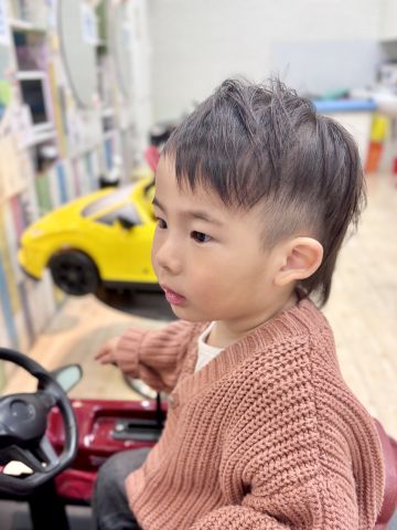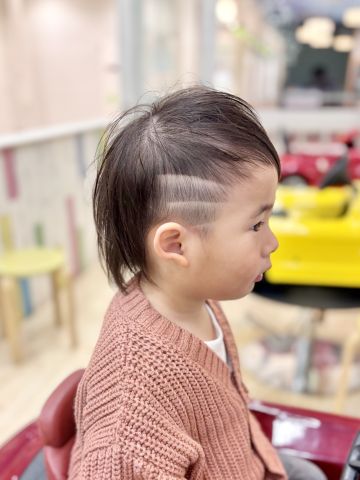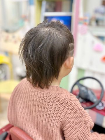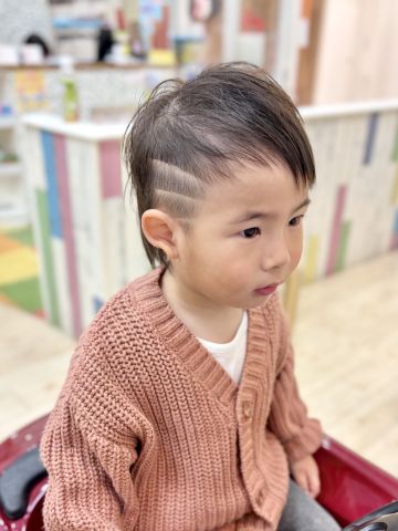 はたくん2さいさん⚡️かっこかわいいマレットスタイル✂️サイドは刈り上げ、襟足は残すスタイルです😊右にはラインも入れて、とってもおしゃれさんになりました✨前髪もアシンメトリーにしてかっこよく!かっこいいけど柔らかい雰囲気のある素敵なスタイルです☺️とっても上手にカットさせてくれてありがとう😊ブログのご協力ありがとうございました!
