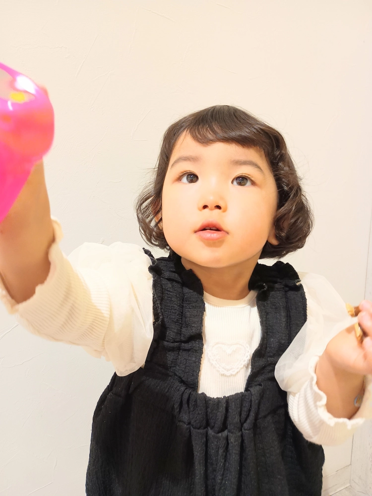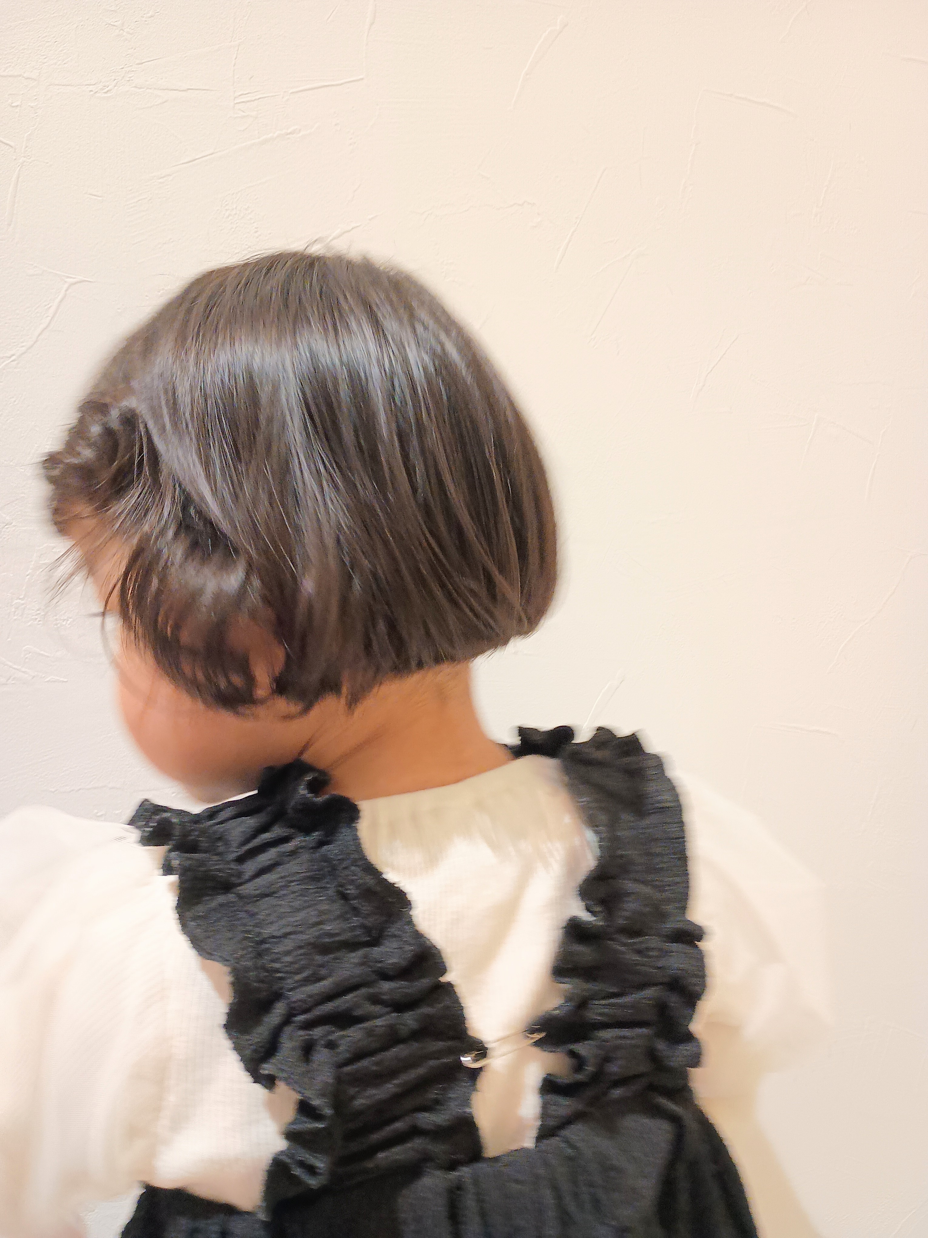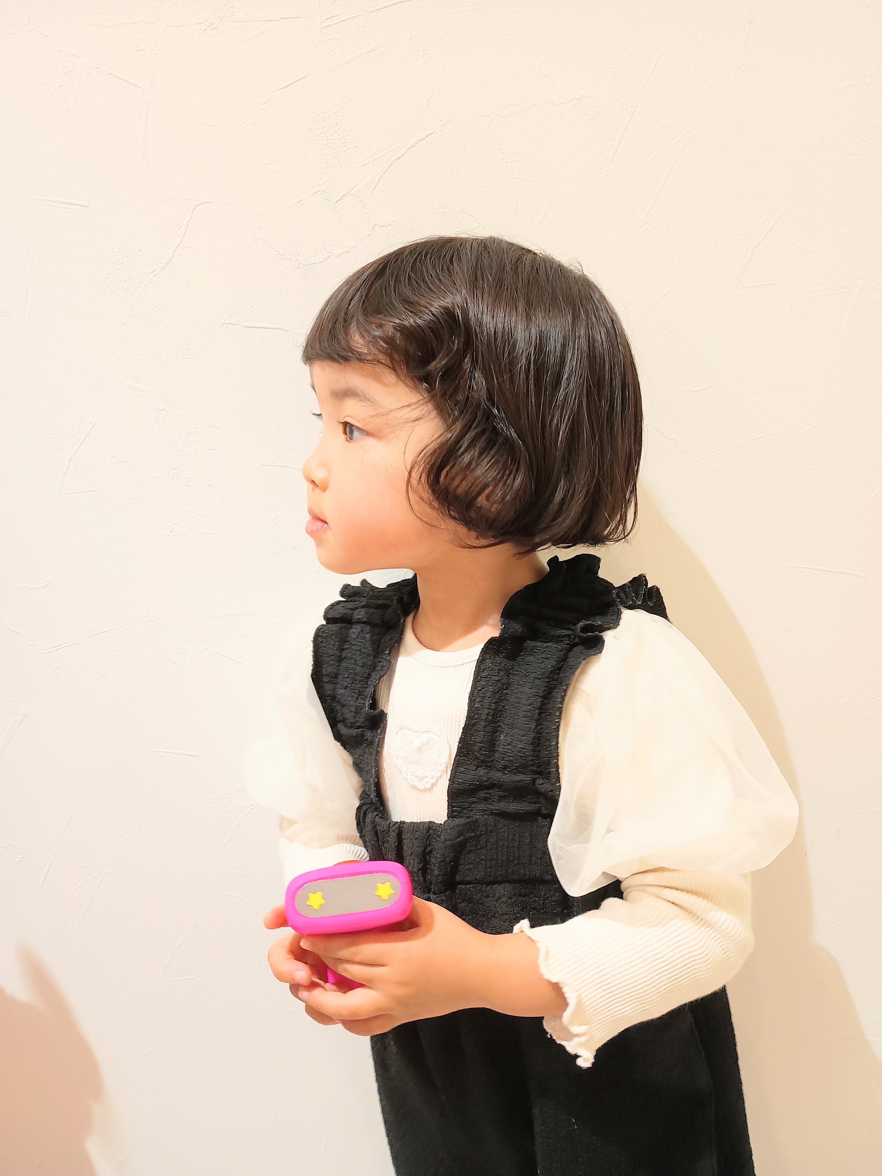 2歳 女の子 可愛らしいウェーブのクセ毛をいかした ミニマムボブです 前髪はおでこ半分までぱっつんと切りました モデルさんのおしゃれな雰囲気に似合ってて可愛らしくしあがりました モデルのご協力ありがとうございました またのご来店お待ちしております