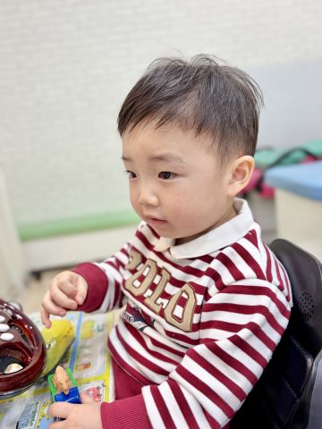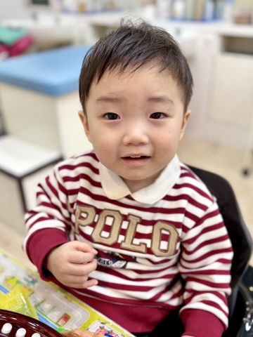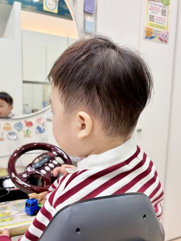 そうしくん2さい👶前回はお母さんの抱っこで頑張っていましたが、今回は車に乗ってごきげんにカットできました🎉✨音楽が好きみたいで、DVDに見入っていました😊刈り上げ気味のすっきりとしたショートで、とてもかっこよくなりました♪かわいい笑顔もありがとう😊ブログのご協力ありがとうございました!