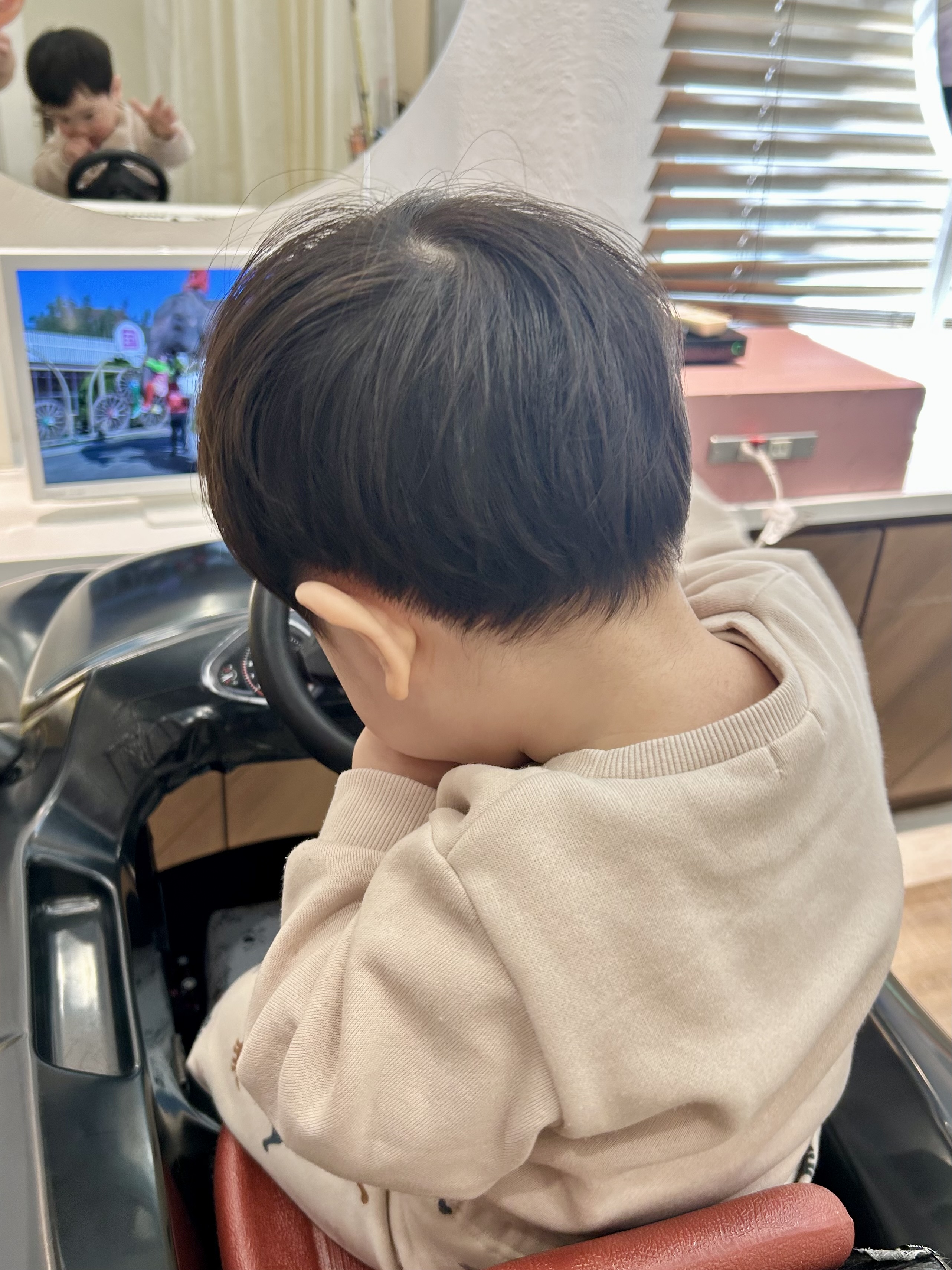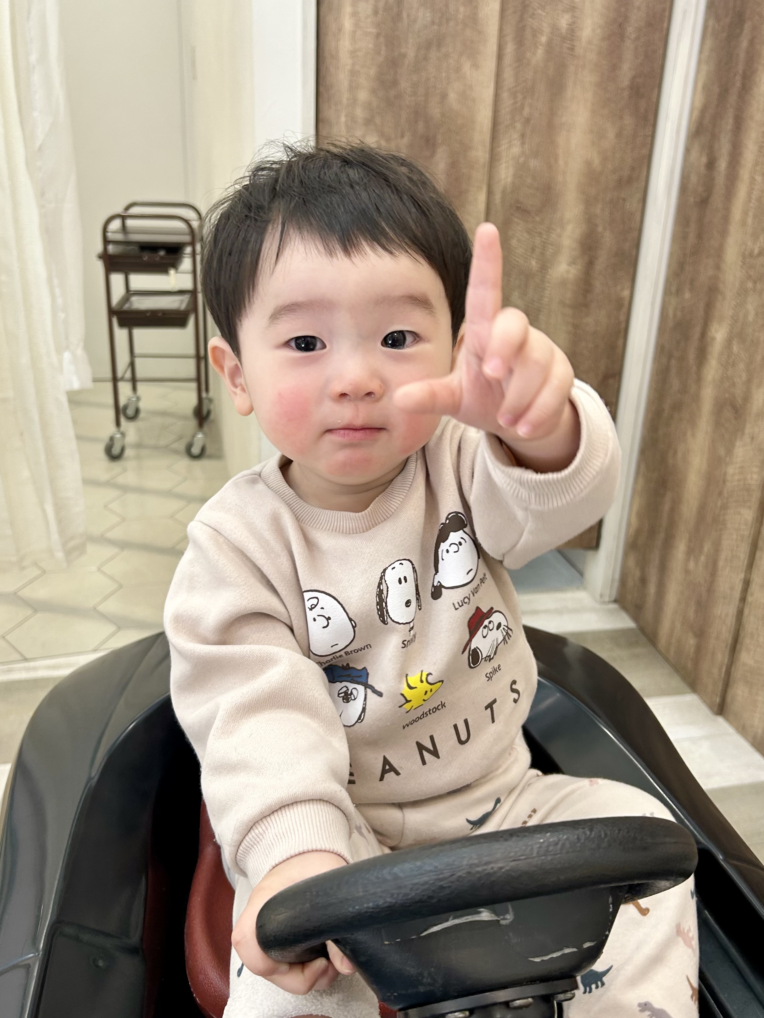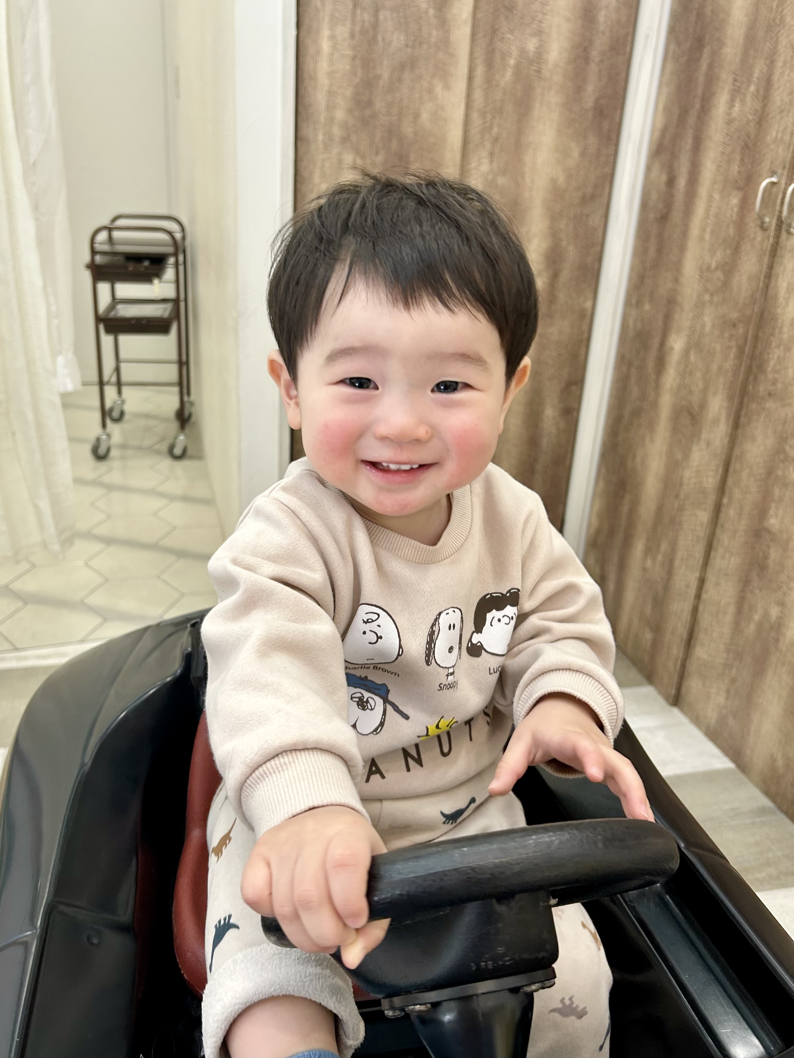 りおんくん 1さい 初めてご来店してくれたりおんくん はじめましてからニコニコで迎えてくれました ナチュラルにお耳を出してスッキリ 前髪はばっさり短めにしてみました ふわっとセットもしてカッコいいです ニコニコカメラ目線もしっかりいただきました 初めての美容室でしたがとても上手でした 運転もたくさんしてくれてありがとう また遊びに来てね お写真のご協力もありがとうございました