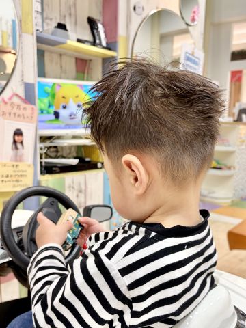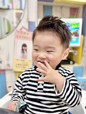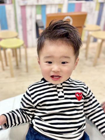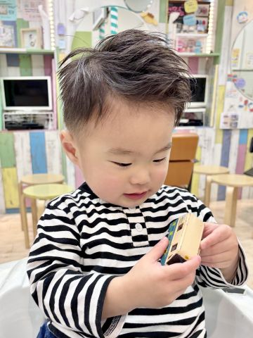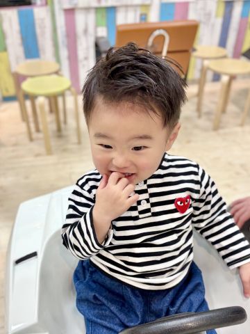 せなくん1さいさん👦車にのって初めてのちょきちょき、ごきげんにできました!ばっさり短くカットしてしっかりおとこのこになりました✨まわりは刈り上げ!トップも短めで遊びがあるくらい、前髪もおでこ半分くらいで長持ち😊お写真もたくさんありがとうございました!ブログのご協力ありがとうございます😊