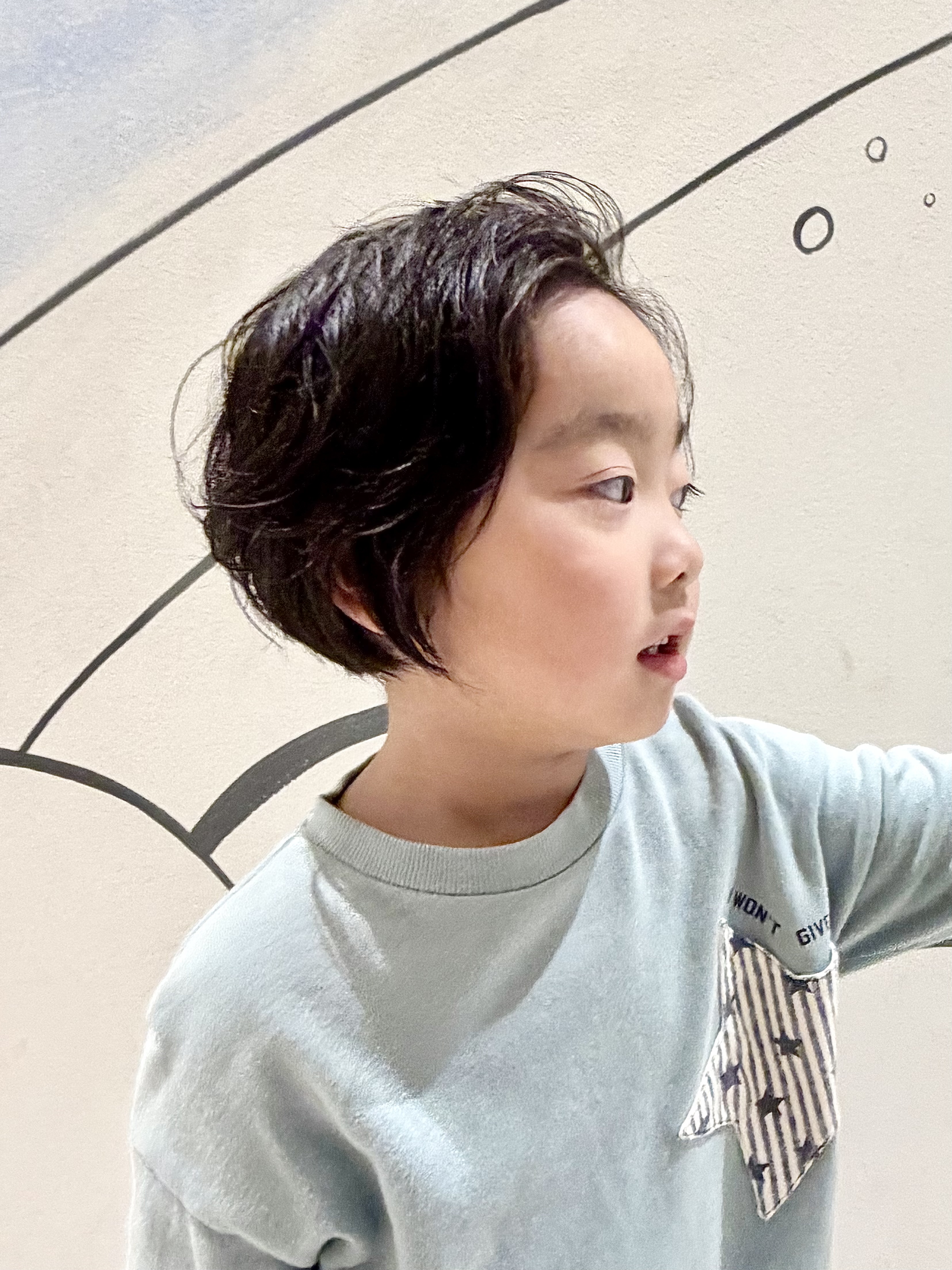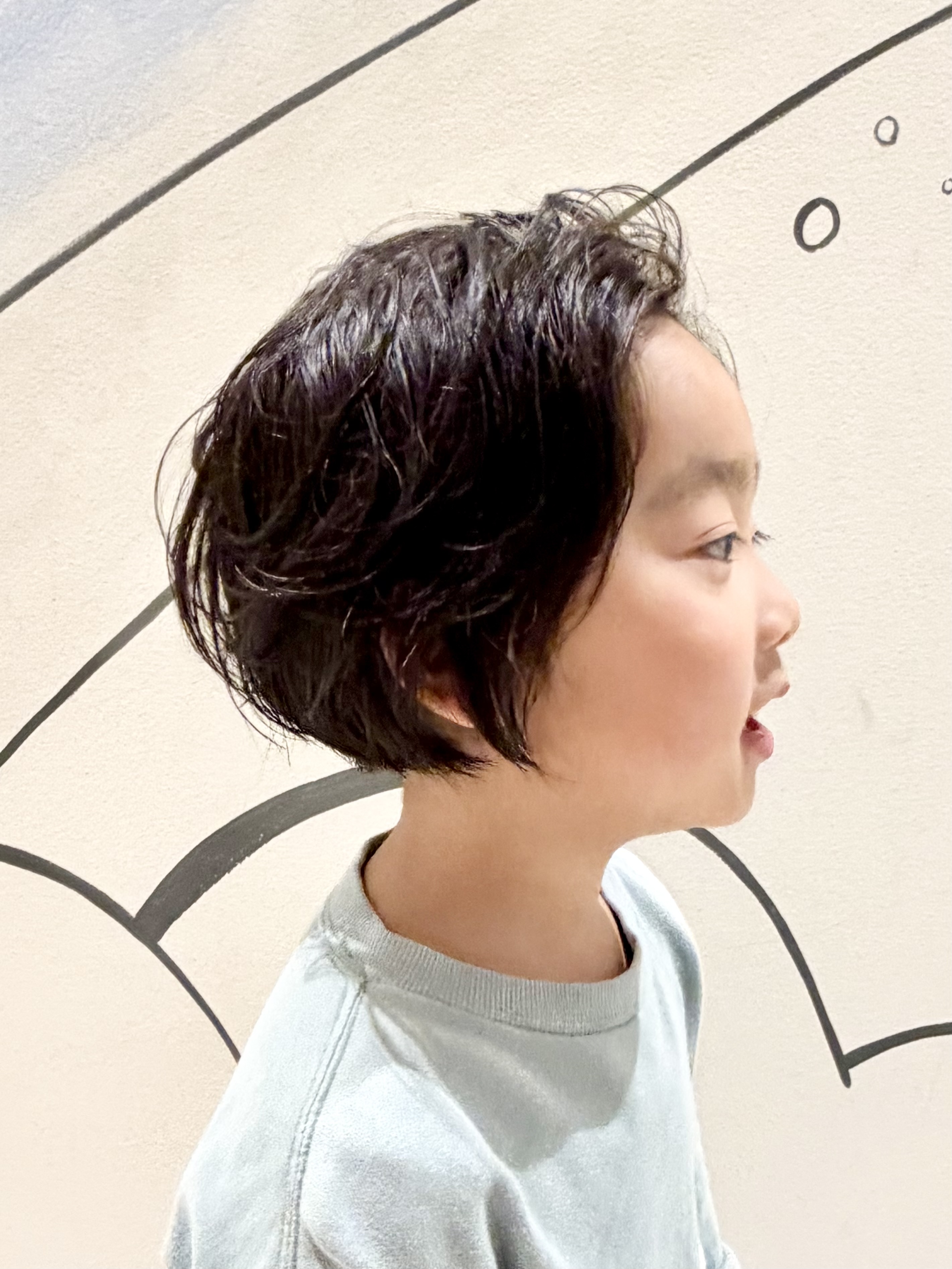 Kくん 4さい 男の子女の子どちらにも楽しめる、ちょっぴり大人っぽいニュアンスボブにカットさせていただいたKくんです緩めパーマのような質感が出る程よいクセがあるので、セットは少しくしゃっとエアリー感を出して、前髪はかきあげてカッコよくしちゃいましたノリノリでモデルさんみたいにポーズしてくれたKくんとても素敵でしたチョキ友のご協力、ありがとうございました😊 Kくん、また遊びにきてね