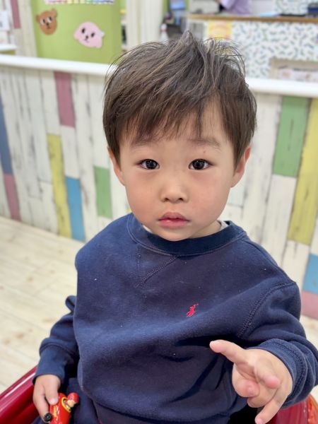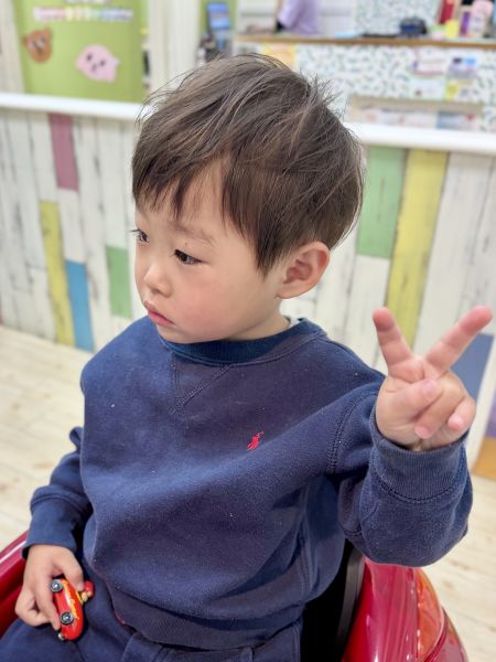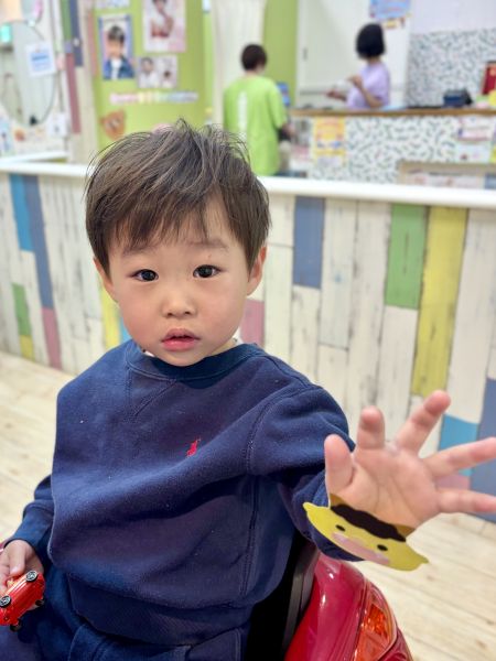 けんしんくん2さい⭐️初めてのチョッキンズ、最初はドキドキ💓でも大好きなおさるのジョージ🐒が始まったら、とっても集中してくれて、とても上手にカットできました✨シャンプーも楽しくにこにこでできてほんとわかったです!!基本のナチュラルなノームコアショートにしました😊かわいさも男の子っぽさもありおすすめのスタイルです!ブログのご協力ありがとうございました😊