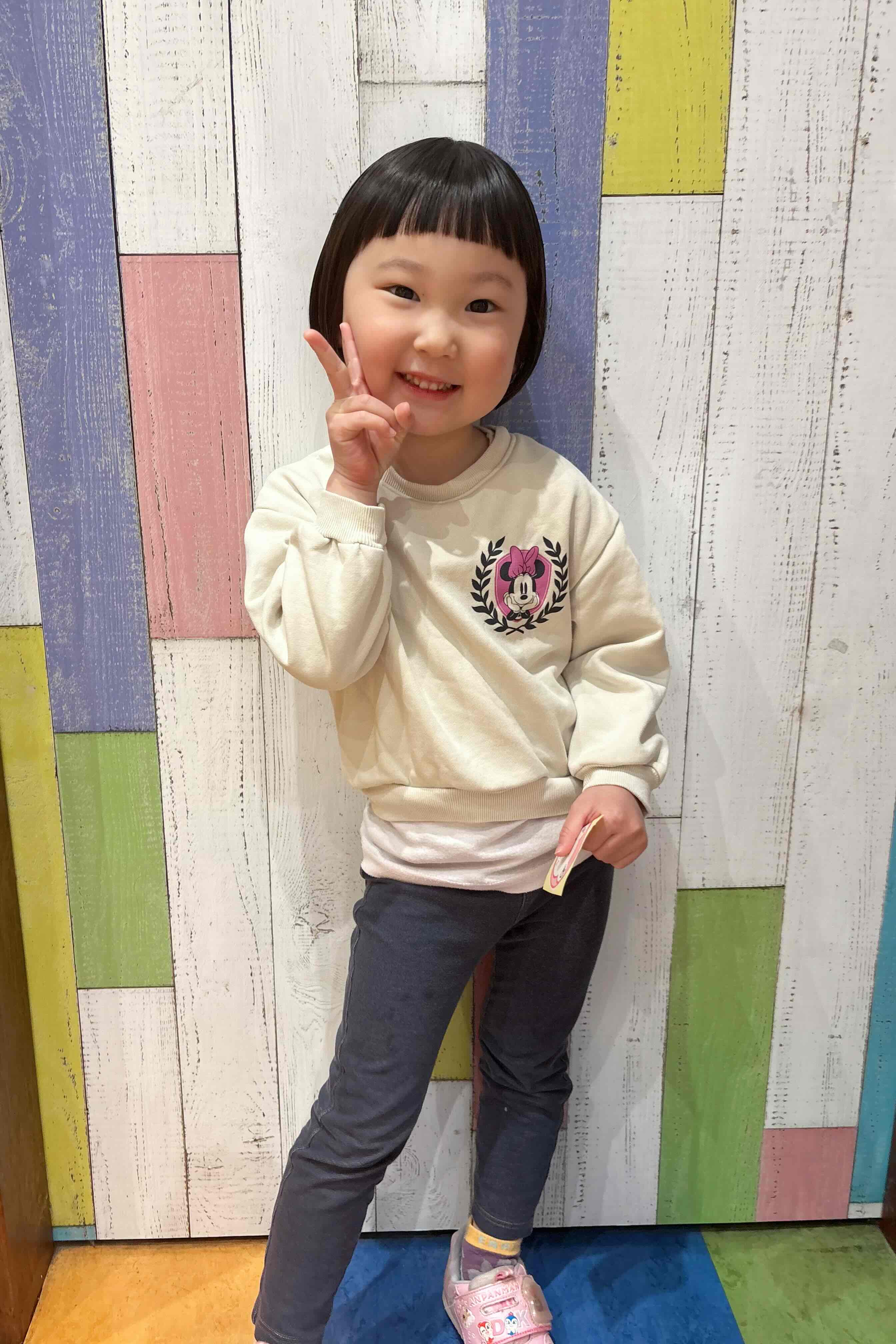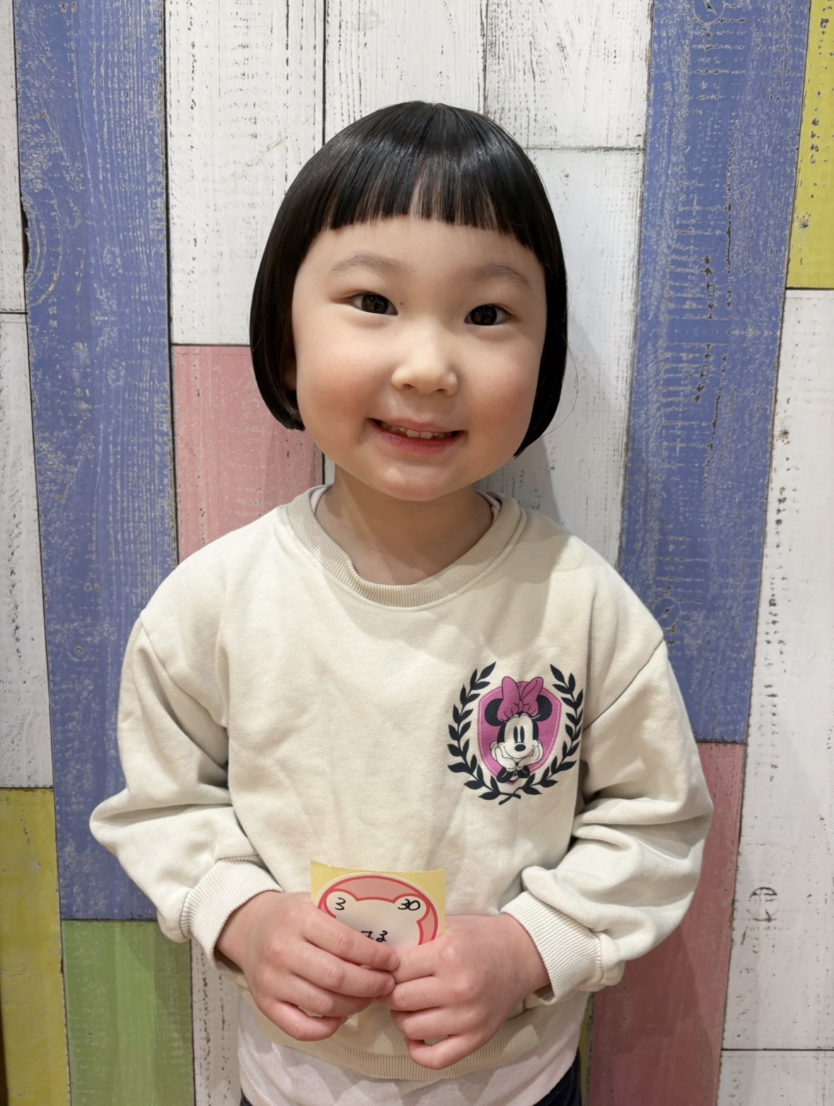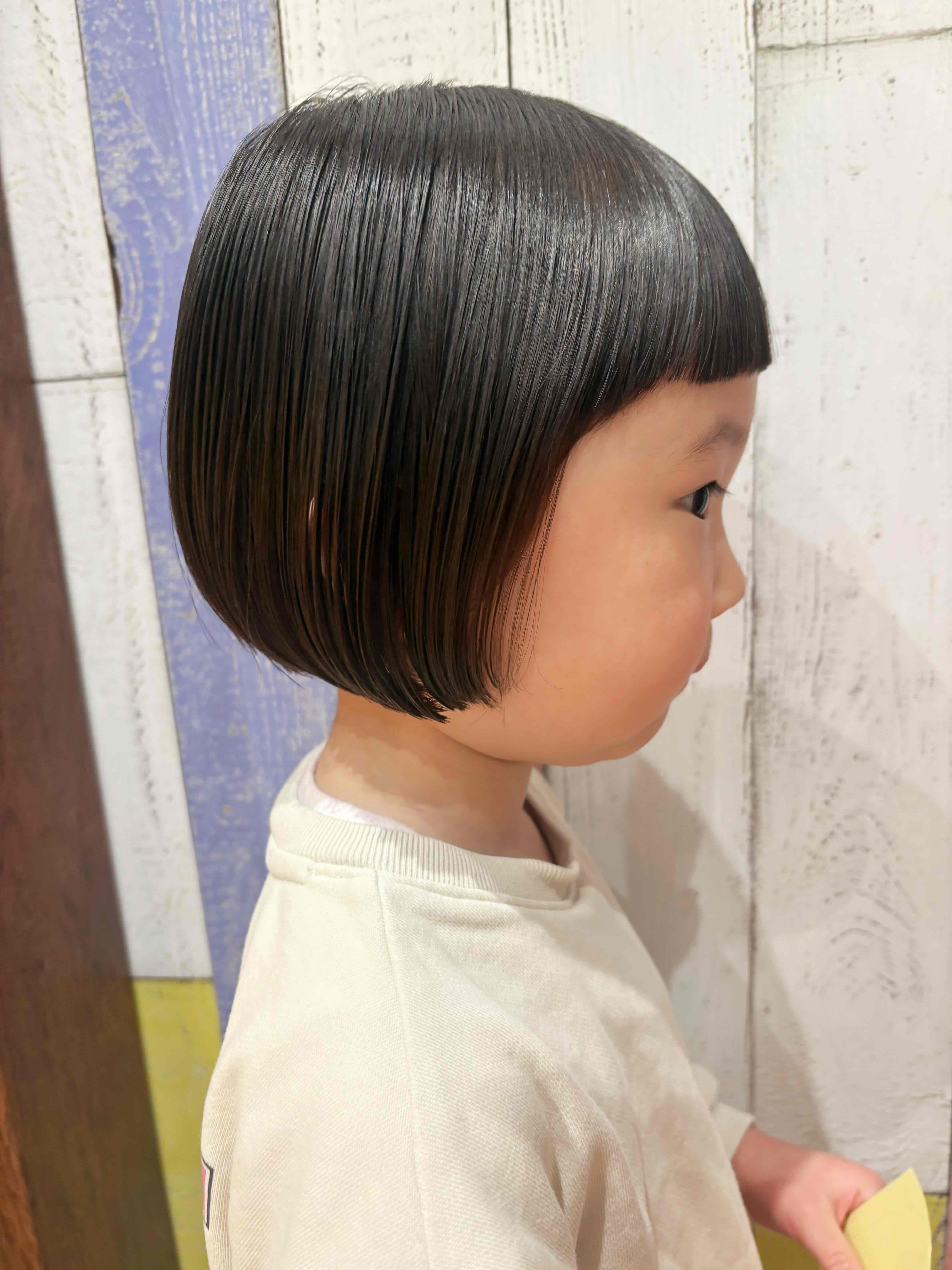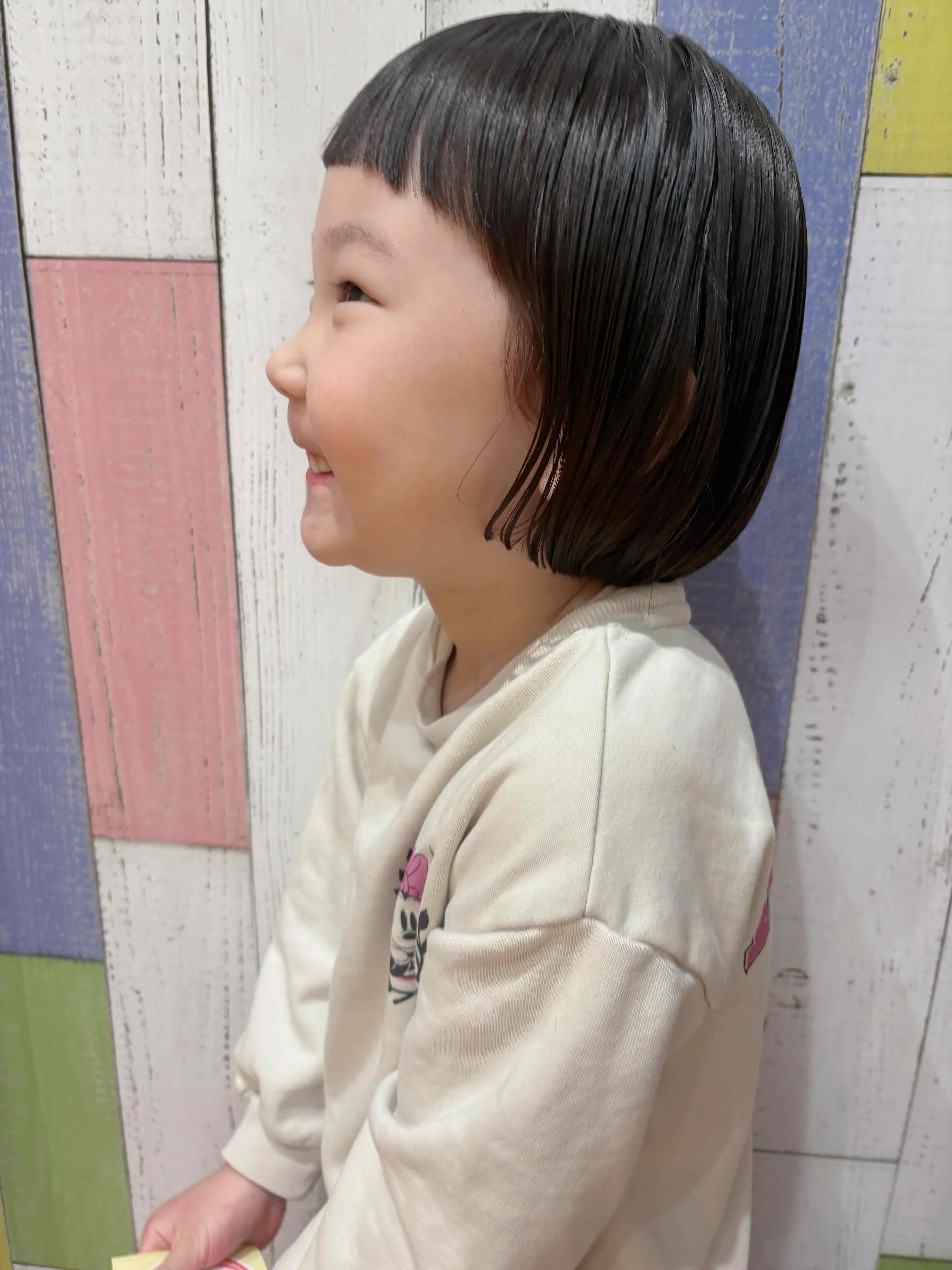 はるちゃん 3歳 襟足ぎりぎりのボブで丸く可愛らしくしました前髪も短めのぱっつんでより可愛らしく 素敵にモデルさんしてくれてありがとう お母様、お写真のご協力ありがとうございました。またのご利用をお待ちしております。