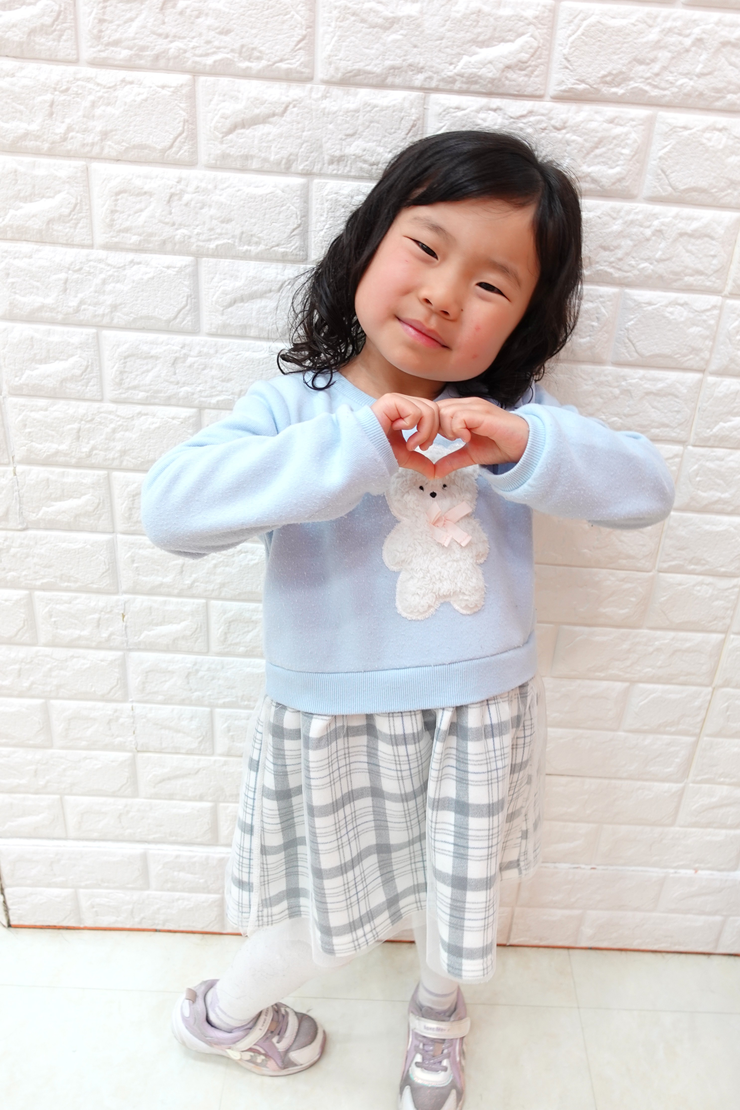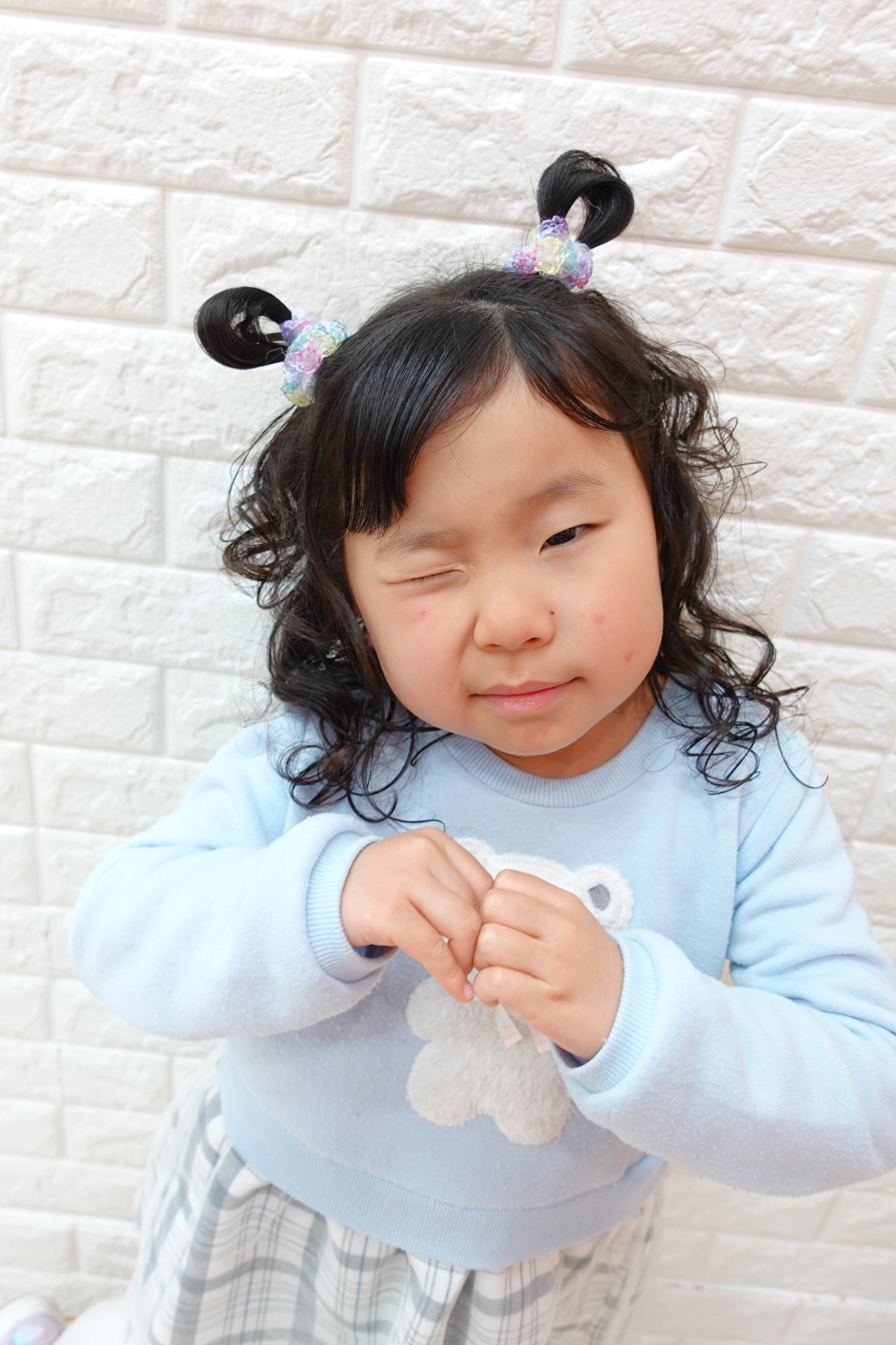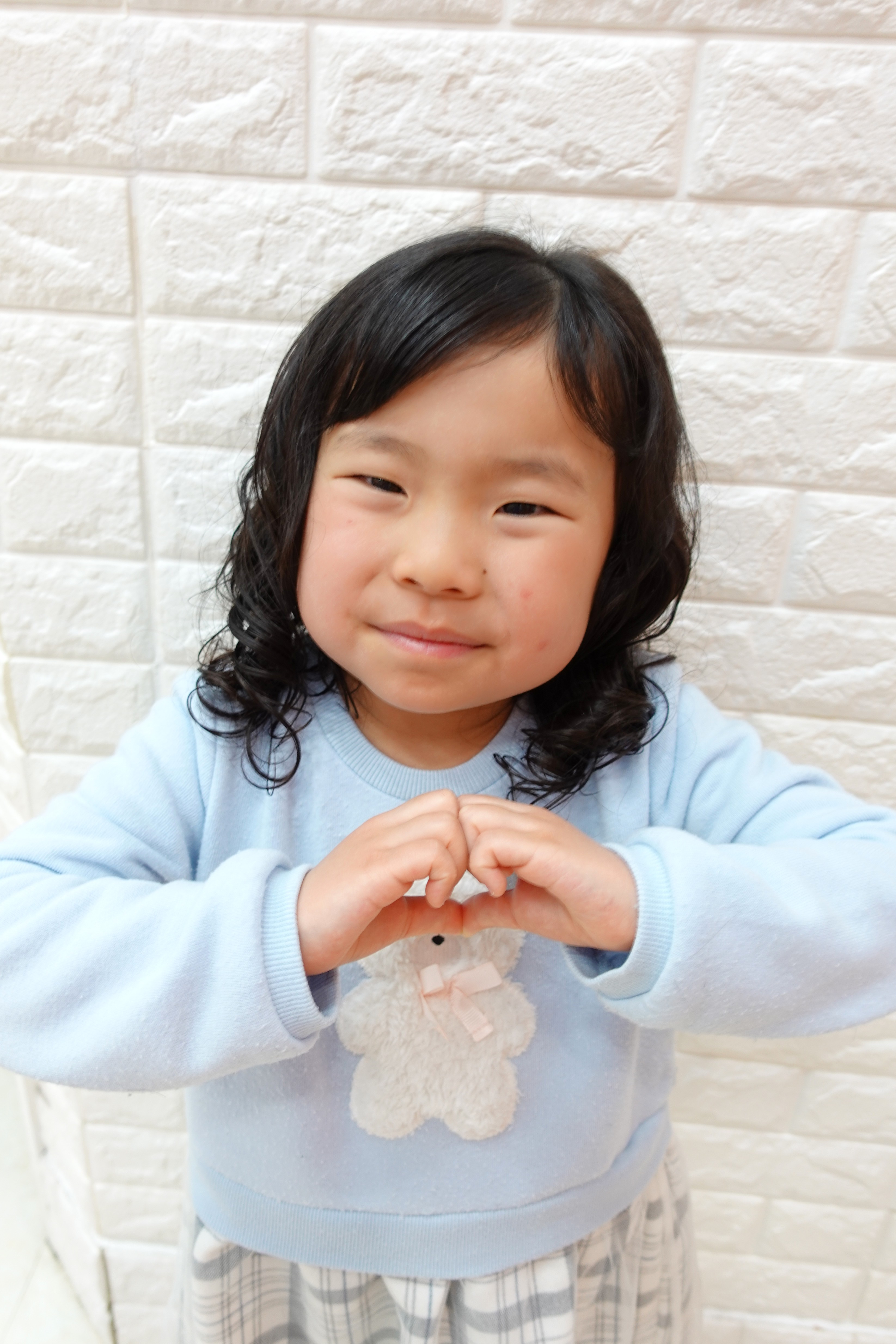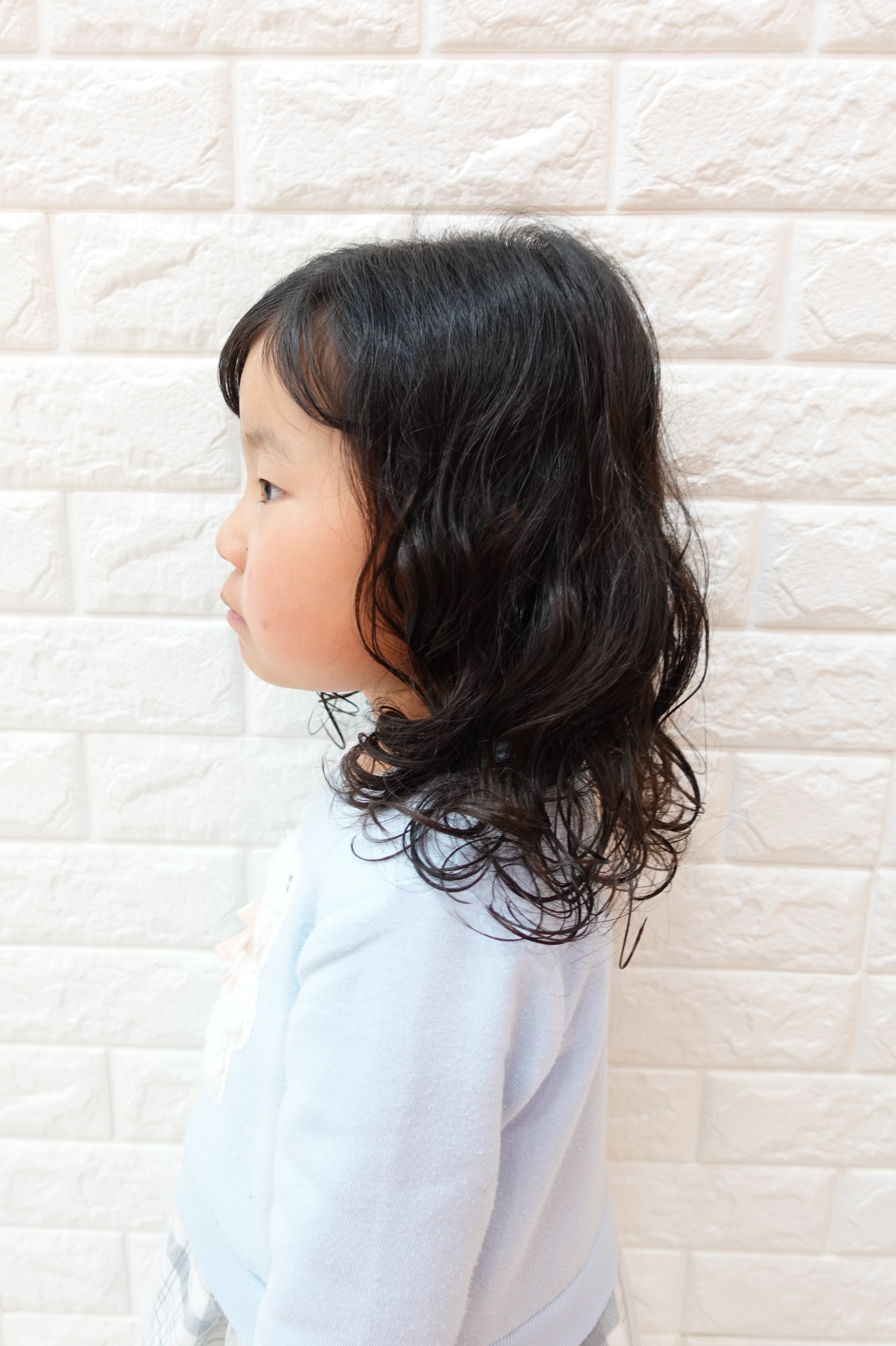 みおちゃん 5才 トップをくるんと結んで毛先を散らしてポップにキュートに 全体はくせっ毛を活かして毛先をくるくるパーマ風に可愛く前髪は流してちょっぴりお姉さんにお似合いで可愛いです ポーズもばっちり可愛いねお写真のご協力ありがとうございました