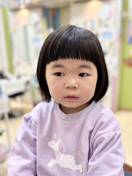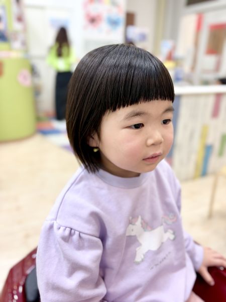 かれんちゃん3さい👧七五三も終わって初めてのカット💇‍♀️ばっさりボブにしました✂️✨にこにことっても素敵な笑顔をありがとう😊あごラインくらいまでカットして、前髪もぱっつんでとってもかわいくなりました👏ブログのご協力ありがとうございました😊