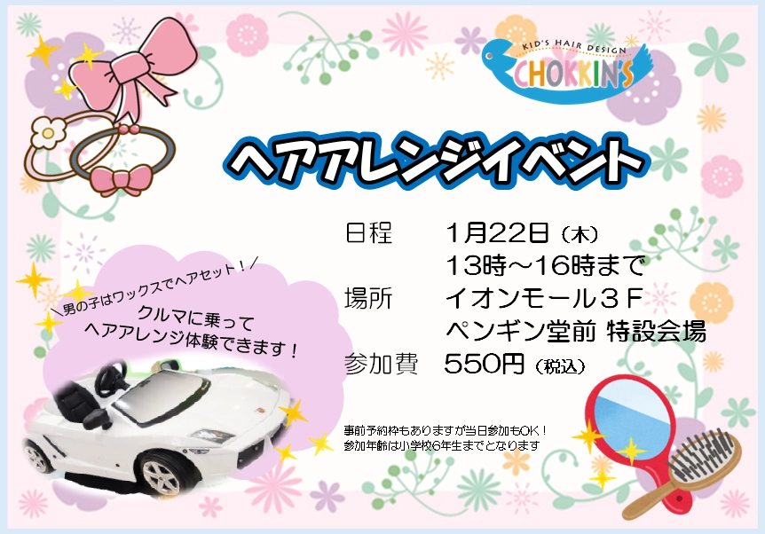 ヘアアレンジイベント開催いたします 日程 1月22日 (木)時間 13時~16時まで場所 イオンモール与野3階 ペンギン堂前 特設会場参加費 550円(税込)事前予約をお電話・店頭にて受付中です当日参加もOKです参加対象年齢は小学6年生までとなります身長によってはイスでの体験となりますアレンジには、ヘアーアクセサリーもついてますチョッキンズに興味はあるけどまだ行ったことがないお子様や、いつもチョッキンズを利用してくれているお子様も、車に乗ってチョッキンズのヘアーアレンジを体験し可愛く、かっこよく変身してみませんか?