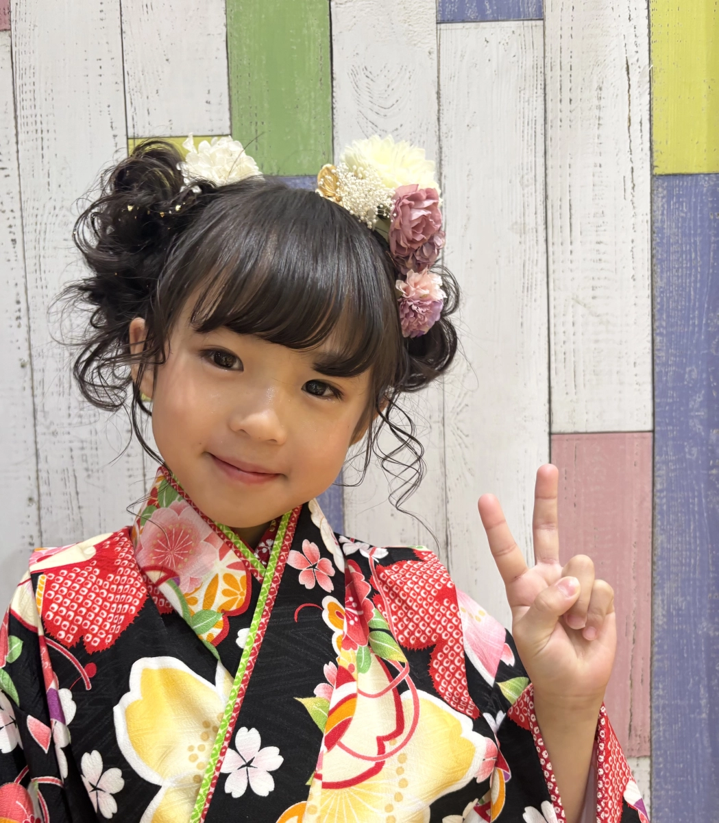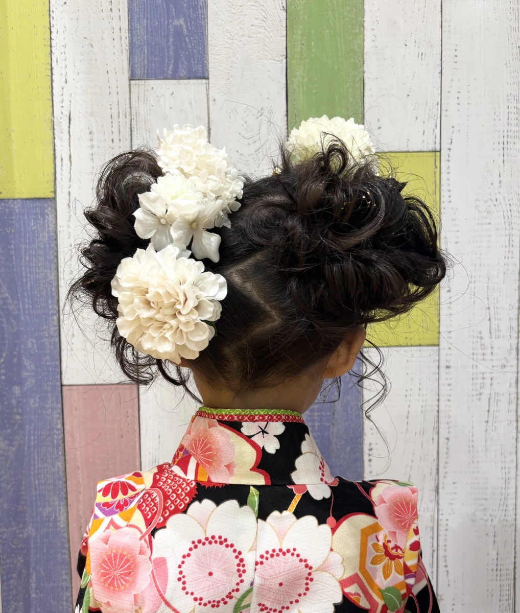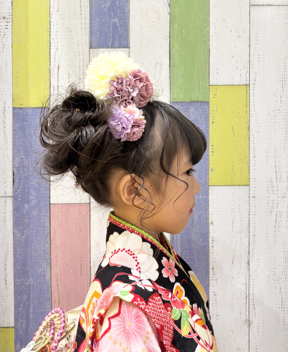 持参していただいたお花のお飾りをちらし、お着物や雰囲気に合ったカールを顔まわりに巻いて仕上げました。